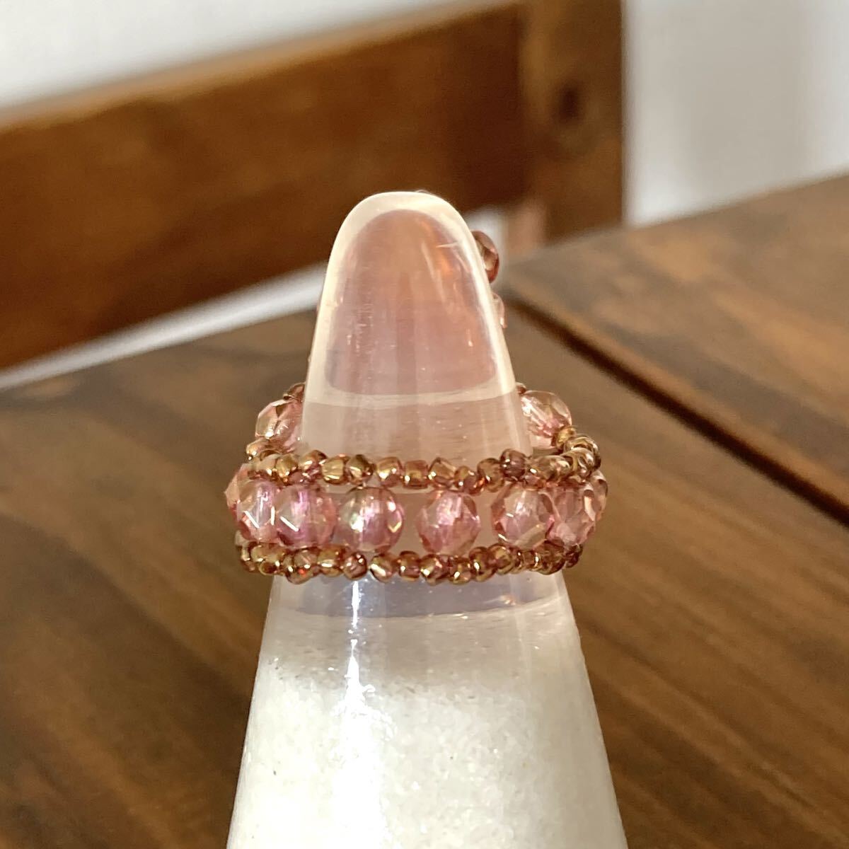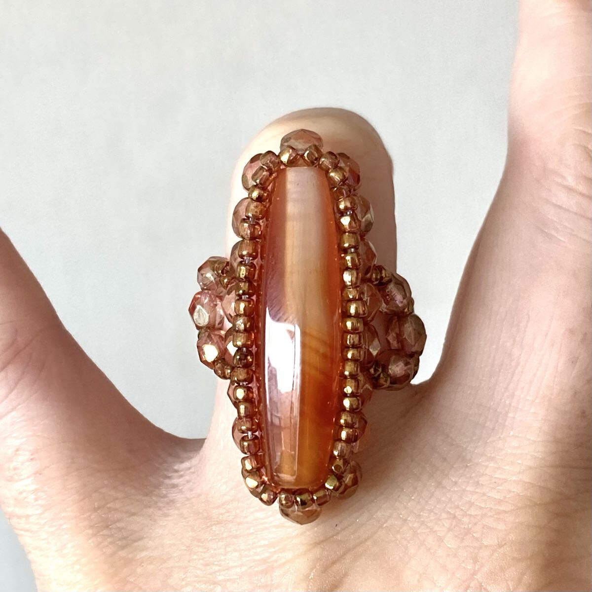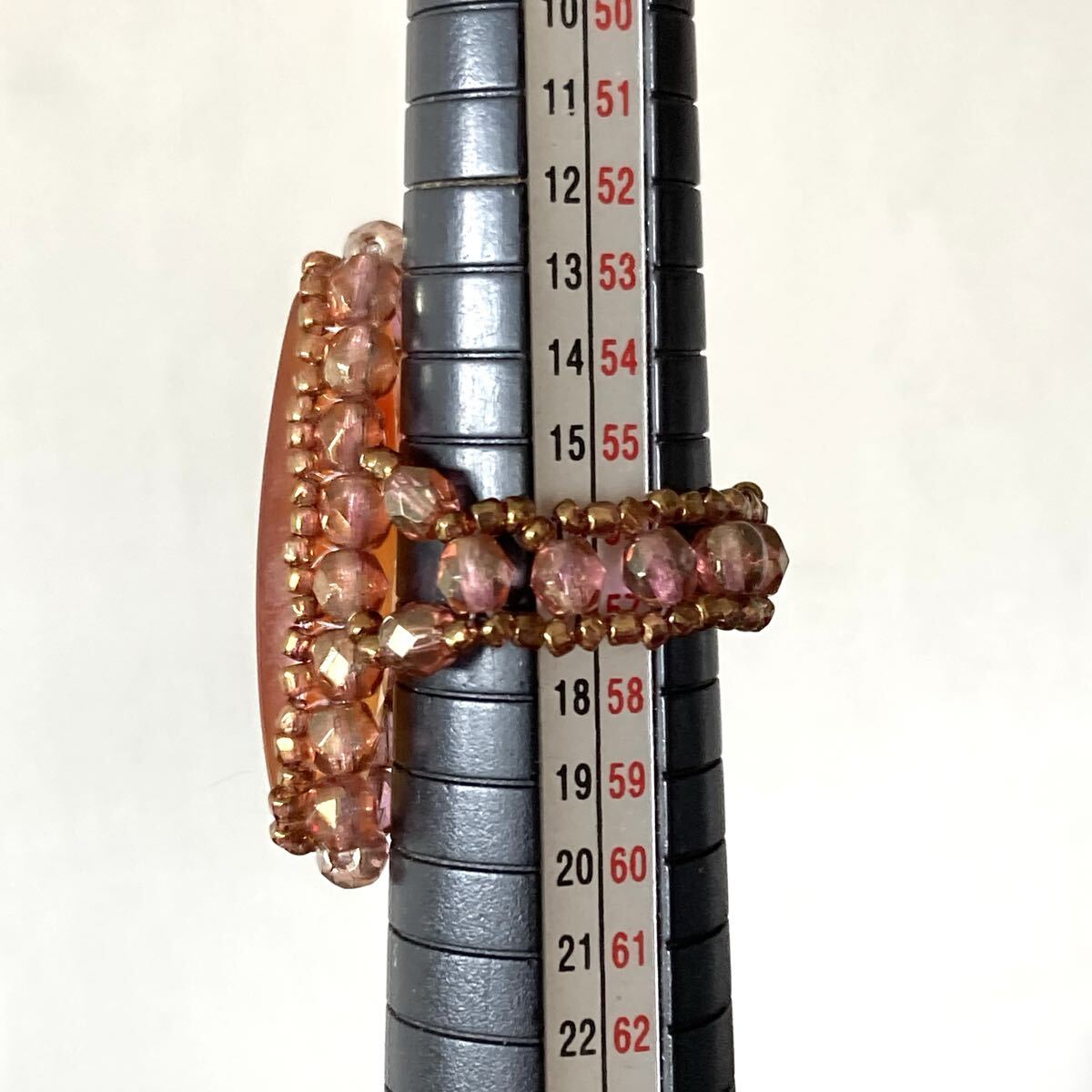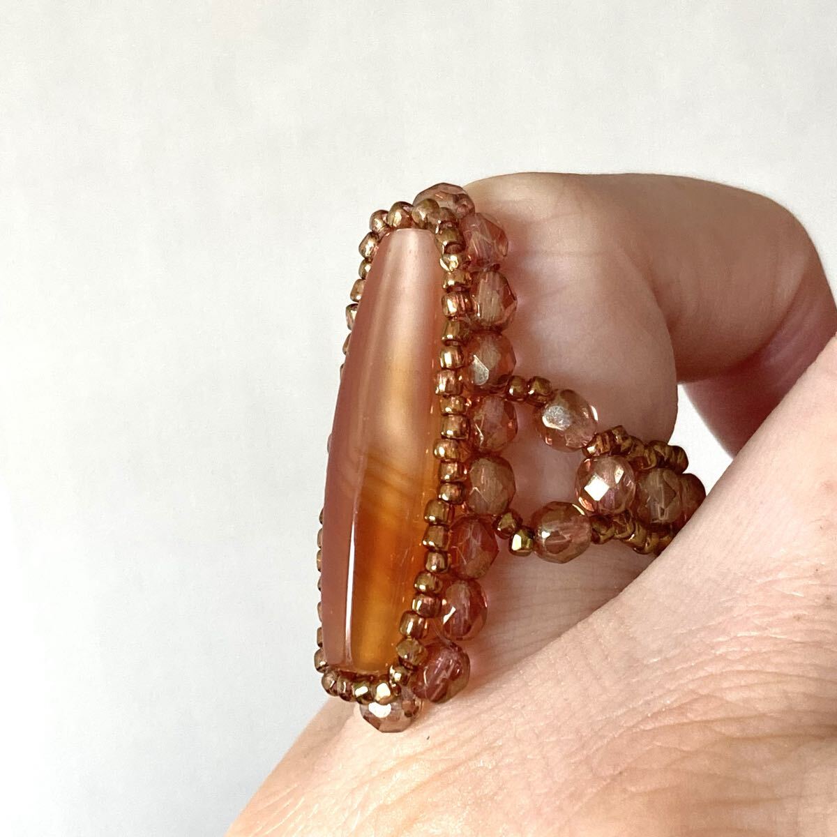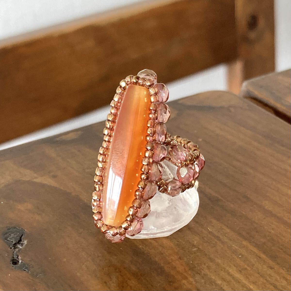 30mmのオレンジの天然石のナツメビーズ、4mmのラスターピンクのチェコビーズ、ブラウンのスリーカットビーズで作ったリングです。