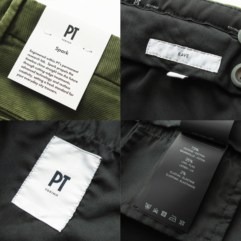 PTの常設ラボで開発されるチノパンに特化したシリーズ「Spark(スパーク)」。厳選されたイタリアンファブリックを用い、そこに最先端の加工を施すことでアタリやムラを出し、まるで何年も穿き込んだような味のある風合いが表現されています。単なる中古加工の服ではなく、上質な素材と縫製、美しいシルエットに裏打ちされており、使い込んだ中にもエレガントさが感じられることが特徴です。