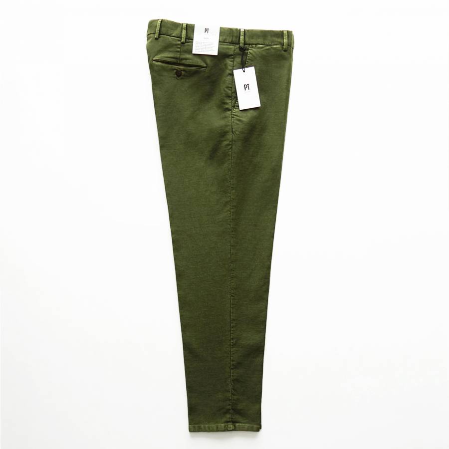 ご紹介するのは、春夏用のコットンリネンファブリックで仕立てられたカジュアルトラウザーズです。一見なんてことのないチノパンですが、イタリアブランドが作る従来のチノパンとは一線を画します。高度なテーラリング技術に裏打ちされたイタリアンチノをベースにしつつも、特殊なガーメントダイによってフェード感を出し、アメリカンチノのようなラフでこなれ感のあるチノパンに仕上げています。流行に左右されないタイムレスなスタイルでありながら、やや深めの股上で、ワタリ(太股)に程よいゆとりがあり、裾へと絞り込んでいくテーパードシルエットによって“今っぽさ”と“美脚”を両立しているところにPTらしさが光ります。もたつきがなく自然にフィットするヒップラインや短めのレングスもいい感じです。イタリアブランドならではの上質な仕立てに裏打ちされた美脚チノですが、こてこてのイタリアっぽさがないので幅広いコーディネートに合わせられるところがミソ。脚を通した瞬間に“そうそう、こんなチノパンが欲しかった”となる、従来のチノパンとは一線を画する大人が大満足できる一本です。