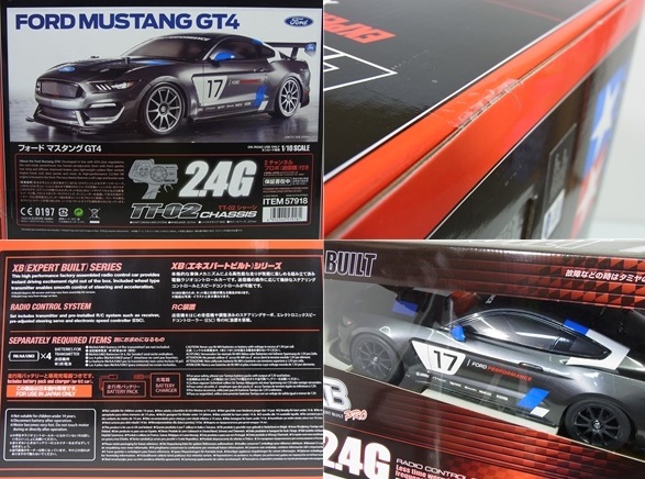 ご覧頂きありがとうございます、出品物は、タミヤ 1/10RC フォード マスタング GT4 XB(エキスパートビルト) 完成品 SET 新品/未開封品になります。 再販された新発売のフォードマスタング GT4 XBとなります、XBセット(完成品モデル)商品となります。 再販品により改良点は、最新ESC(TBLE-04S)を標準搭載、後々のシステムアップ(ブラシレスモーター)へも対応しております新モデルです。(製品(塗装/デカール等もさらにリアルにバージョンアップされていると思います) 新品購入後、未開封のまま個人保管している物となります。 XB(エキスパートビルト)製品は、メーカーにて組立/塗装等された完成SET品となります、シャーシ(本体とは別に)、バッテリー/メカ/モーター/2.4GHz プロポ等全て付属されており、商品開封後ただちに走行可能なモデルです。 ※送信機用電源(単3形電池4本)は、別途ご準備下さい。 【商品状態】 新品/未開封 【商品詳細】 メーカー:TAMIYA 品名:No.218 1/10RC フォード マスタング GT4 XB (エキスパートビルト)PRO XBシリーズ完成品 メーカー品番:Item No:57918 (TT-02)シャーシ 【主な付属品】 プロポ(送信機)2.4GHz メカ類(サーボ/受信機/スピードコントローラー/モーター等) バッテリー/充電器 【製品紹介】 【 走りを熱くするアメリカン・マッスルボディが注目 】 欧米を中心に人気を集めているFIA-GT4マシンによるスポーツカーレース。このFIA-GT4レギュレーションに合わせて開発されたフォードの市販レーシングカー、マスタングGT4を再現した完成電動ラジオコントロールカーです。エアアウトレットが開けられたボンネットをはじめ、フロントスポイラーやリヤウイング、ディフューザーを装備した、盛り上がった筋肉を連想させるパワフルなマッスルボディをポリカーボネートで実感たっぷりに再現。精悍なガンメタルで塗装し、2016年11月のSEMAショーで発表された当時のマーキングで仕上げました。また、前後ライトやフロントグリル用メッシュもステッカーで表現。ドアミラーや大型のリヤウイングとともに見ごたえを高めます。 【 操縦しやすくセッティングも楽しめるシャフト4WD、TT-02を採用 】 組み立て済みのシャーシは、走行用バッテリーを左、モーターを右に縦置きにレイアウトした好バランス設計により操縦安定性に優れたシャフトドライブ4WDのTT-02。サスペンションはダブルウィッシュボーン4輪独立。前後の密閉式ギヤボックスにはスムーズな差動を生み出す樹脂製4ピニオンタイプのデフギヤを内蔵しました。また、ホイールハブはブレーキディスク風のデザインとし、実車のレーシングカートのバンパーをイメージしたフロントバンパーサポートを装備するなど、遊び心もたっぷり盛り込んでいます。さらに、パーツの組み換えなどによりホイールベース、車高、トレッドがそれぞれ2種類選べ、10種類の幅広いギヤ比が選択できるモーターマウントなどセッティングもOK。ガンメタルカラーの10本スポークホイールにはレーシングスリックタイヤを装着しました。前後進ともにスムーズなスピードコントロールが楽しめるESC(エレクトロニック・スピード・コントローラー)も搭載。 【 複数台で気軽に遊べる2.4Gプロポを使用 】 完成車体はもちろん、車のコントロールに最適なホイールトリガータイプの送信機、走行用7.2Vバッテリー、充電器もセットしました。RCメカはクリスタル交換など、バンド調整の必要がなく、気軽に複数台で楽しめる2.4GHzプロポセットを採用。コンピューターの無線LANなどにも使われている2.4GHzは、送信機と受信機(車体)が1対1で対応するので混信の心配がなく、しかも送信機と受信機はペアリング済みですので、面倒なセットアップ作業の必要がありません。また、送信機はグリップカバーとトリガーカバーを採用。脱着することで調整でき、手の小さな方でも操作しやすい構造です。ESC(エレクトロニック・スピード・コントローラー)は15.5T以上のブラシレスモーターにも対応したセンサー付モデルのTBLE-04Sを搭載。 【 基本スペック 】 ●全長459mm、全幅188mm、全高130mm ●ホイールベース257mm ●タイヤ幅/径=前後とも27/67mm ●フレーム=バスタブタイプ ●駆動方式=縦置きモーター・シャフトドライブフルタイム4WD ●デフギヤ=前後とも樹脂製4ベベルタイプ ●ステアリング=3分割タイロッド式 ●サスペンション=4輪ダブルウィッシュボーン ●ダンパー=前後ともフリクション ●ギヤ比=キット標準8.27:1(別売のピニオンと組み合わせて11.38:1?7.28:1までの10種類のギヤ比が選択可能) ●モーター=540タイプ ●スピードコントローラー=ESC(エレクトロニック・スピード・コントローラー)搭載 【 別にお求めいただくもの 】 ●送信機用単3形電池4本 ※商品の詳しい詳細、仕様等はメーカー商品ページにてご確認下さい。 【出品物】 新品/未開封 タミヤ 電動RC 1/10RC フォード マスタング GT4 XB 完成品 以上写真に写っております物が全てです。 ※ 新品/未開封ですので勿論元箱はございます、新品購入時から元箱に僅か