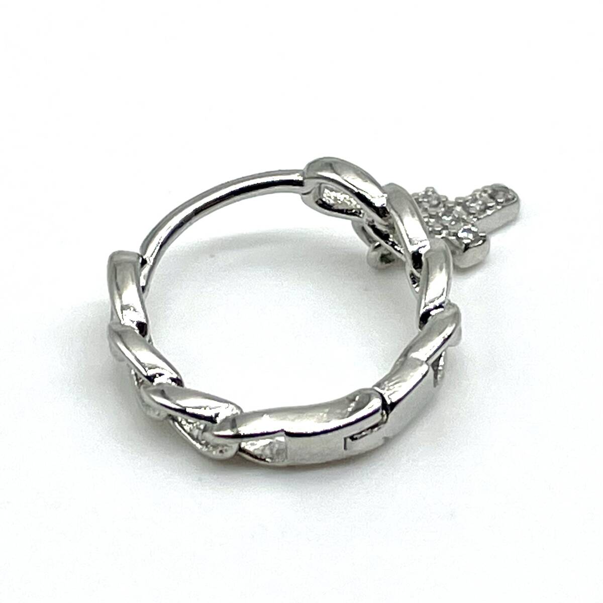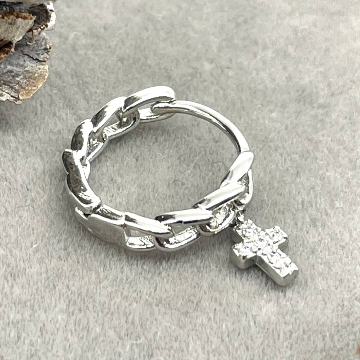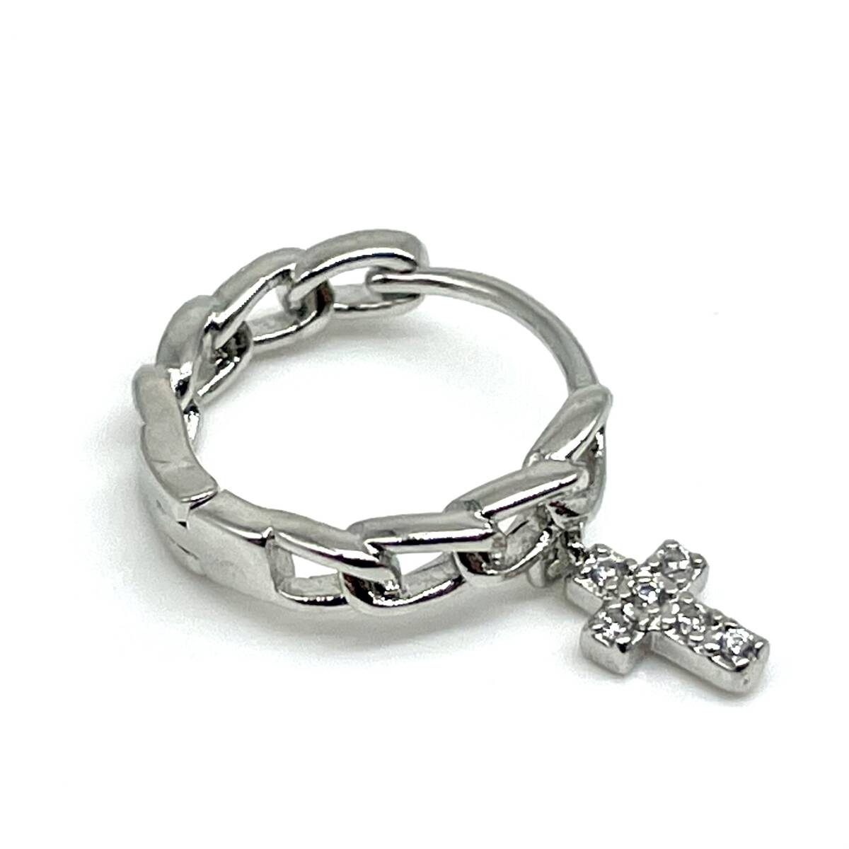 チェーンデザインのフープピアスにジルコニアを配したクロスチャームがデザイン性の高いリングピアス。