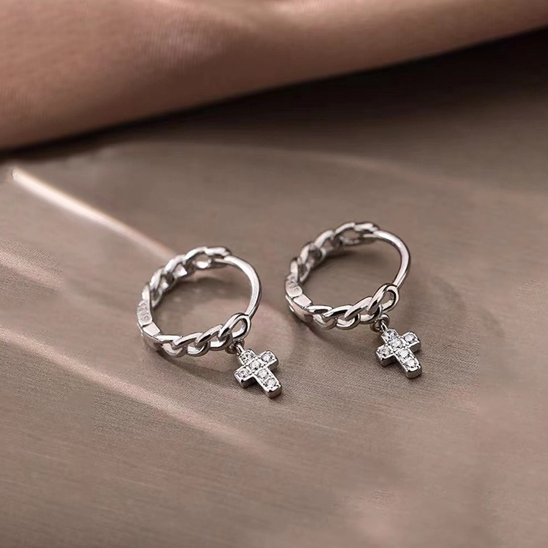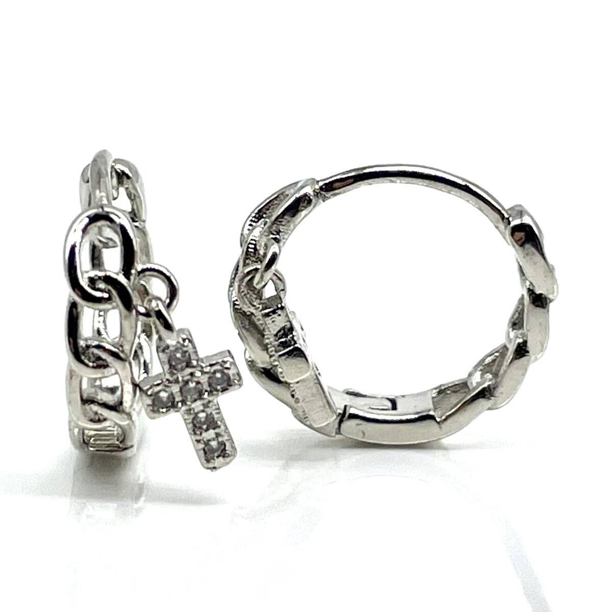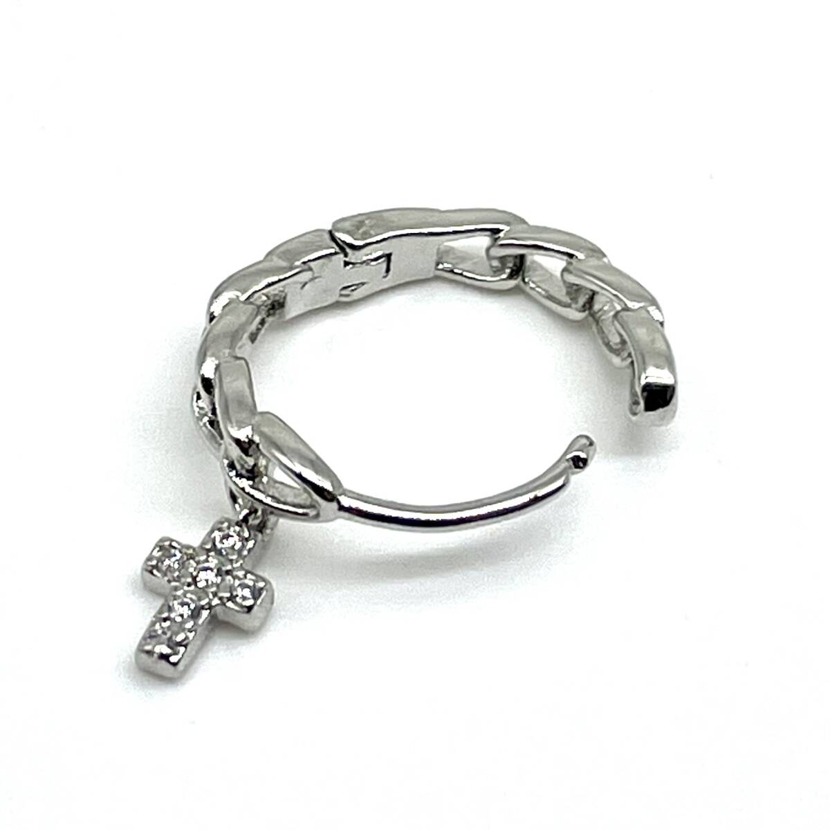 チェーンデザインのフープピアスにジルコニアを配したクロスチャームがデザイン性の高いリングピアス。