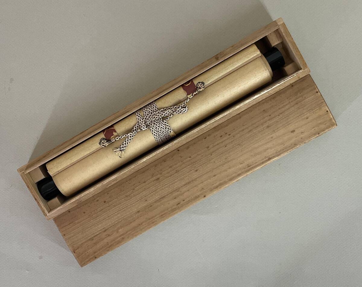 古い掛け軸は軸先を固定している接着剤が弱り、輸送途中の衝撃で軸先が外れてしまう場合がございます。