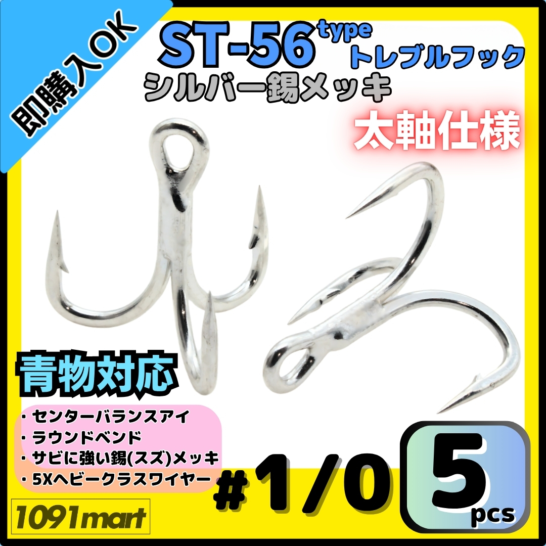 【送料無料】ST-56タイプ 防錆トレブルフック #1/0 シルバー 5本セット 太軸 5Xワイヤー使用 大物 青物対応 ヘビークラストリプルフック