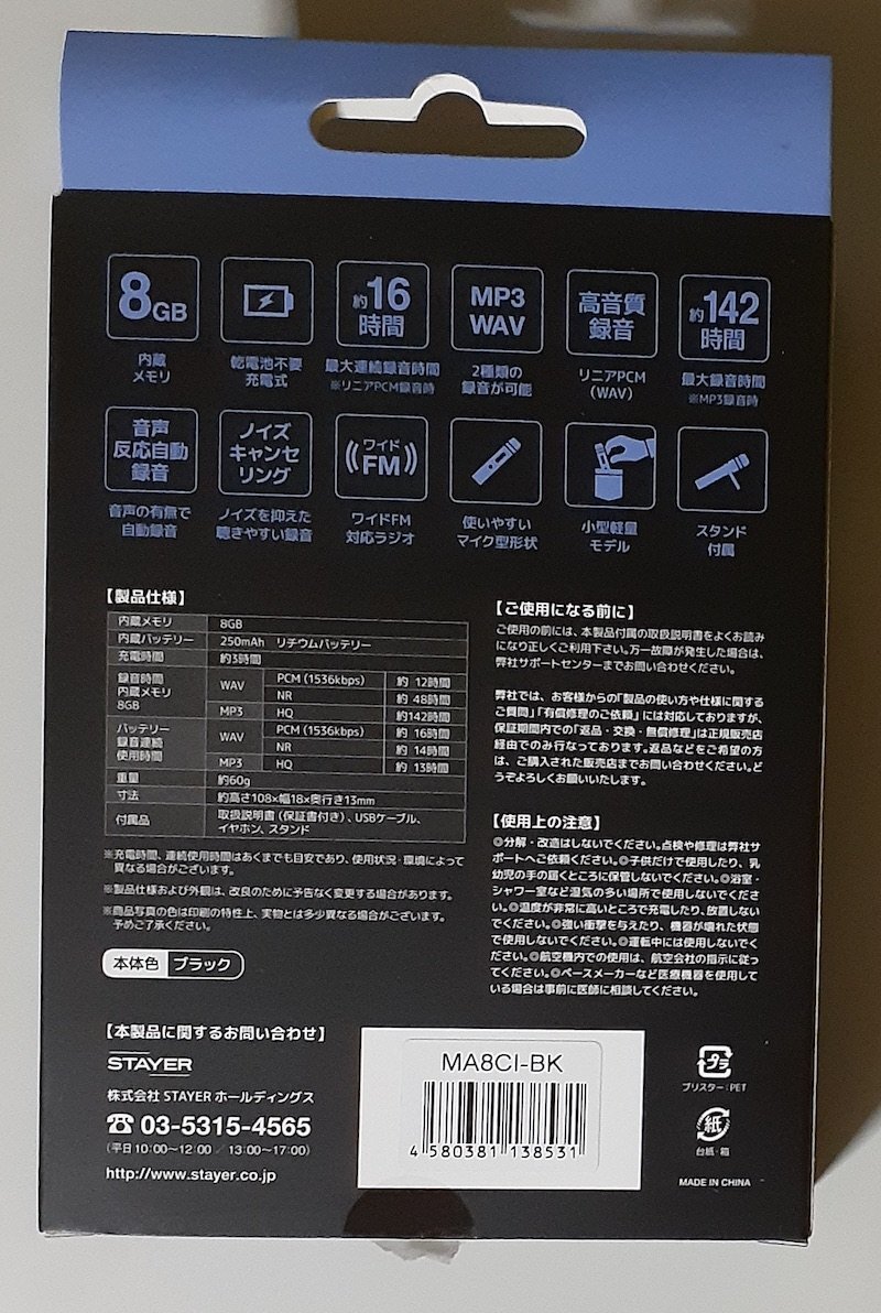 6460 ICレコーダー MA8CI-BK 内蔵メモリ8GB マイク型 充電式 高音質録音リニアPCM(WAV) ノイズキャンセリング ワイドFM対応ラジオ STAYER