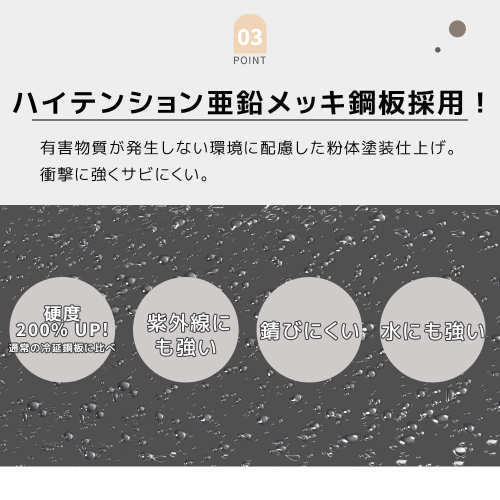 • 【金属の頑丈な安定感スチール素材】素材は、スチール板を採用、紫外線にも強く錆びにくいです。水にも強い仕様です