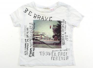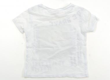 実際のサイズ表記は、98cm。左肩スナップボタン付き。首元が薄く汚れています。プリントにひび割れあり。毛羽立ち・洗いざらし感があります。