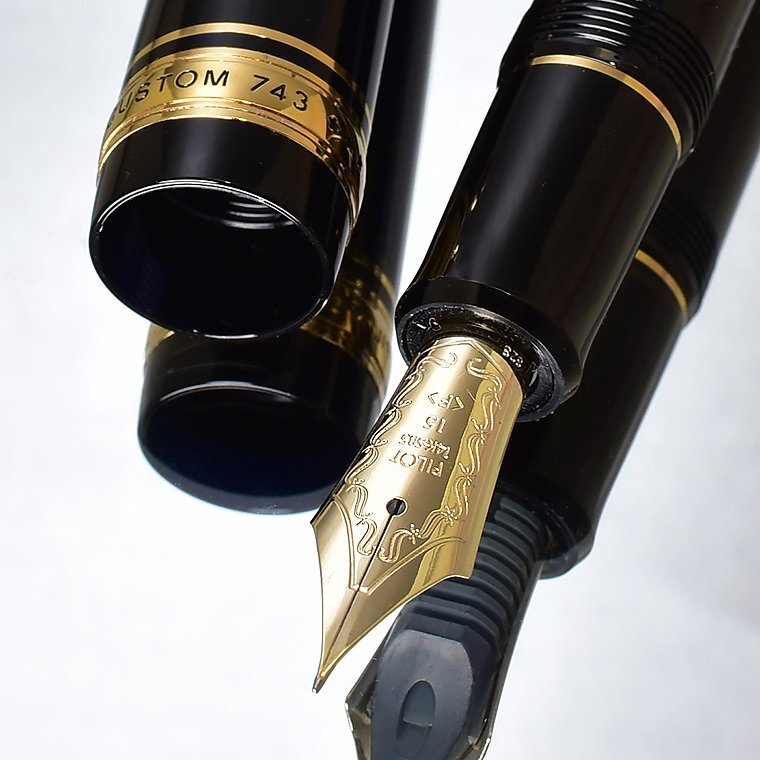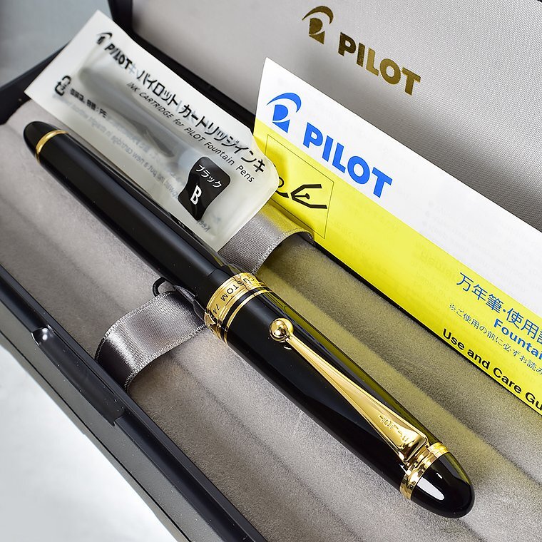| 【PILOT/パイロット】 カスタム 743 万年筆 ブラック×ゴールド ペン先 14金 B(太字) プッシュ式コンバーター内蔵(CON-70N) こちらは展示品の試し書きで使用したインク通し済商品となります。 こちらを予めご了承の上、入札ください。 ![]() ※画像はFですが出品はB(太字)です 高級万年筆の定番!PILOT カスタム743万年筆 を入荷しました。 PILOTの技術の高さ・ラインナップの多さ・そして品質の良さは、 皆さんもよくご存知かと思います。 このカスタム743はそのPILOTの魅力を結集した、高度の万年筆です。 ![]() 外見はベーシックでブラックボディの葉巻型のフォルムに ゴールドトリムのキャップリングとクリップで構成されており、 名品モンブランの146を連想させる気品溢れる万年筆です。 少し太めの丸軸はどなたの手にも馴染む良いバランスですので、 年齢や性別を問わず、お勧めのモデルです。 ![]() ※画像はFですが出品はB(太字)です ![]() ※画像はFですが出品はB(太字)です ペン先は、極細から特太字まで多種類のペン先バリエーションがありますが 今回はB(太字)をご用意しました! 材質は14金。硬すぎず、柔らかすぎないバランスで、初めてお使いになる方から 万年筆一筋!という方まで、なじみやすいニブです。 さらに特徴的なのがそのインクフロー。 キャップを外したまま数分書かない状態が続いても、書き出しから、 インクのカスレがほとんどなく、気持ちよく書くことができるのです。 これが、結構長くても大丈夫のようで 「10分近く外したままでも、しっかりと書き出しからインクがでてくる・・・」 というインプレッションもブログで目にしました。ハードユーザーはもちろんのこと、 考えながら大切な手紙を書く時などに威力を発揮します。 ![]() この743万年筆のもう一つの楽しみが、プッシュ式コンバーターによるインクの補充。 普通のコンバーターはネジをクルクルと回転させますが、 これはプッシュ式ボタンを押すだけというものです。何度も押せば押すほどに、 コンバーターがゴクゴクとインクを飲みこんでくれる・・・という、 なかなかのスグレモノです。 ![]() ※画像はFですが出品はB(太字)です この機構が威力を発揮するのが、ボトルのインクが少なくなった時。 皆さんも経験があるかも知れませんが、ボトルインクが残り少なくなり、 ボトルの底に少ししかないインクを吸い上げるのはかなり大変です。 でも、このプッシュ式なら、片手でプッシュするだけなので、楽々吸入することが できるのです。外見こそスタンダードですが、使ってみると手放せなくなってしまう、 楽しさと魅力がいっぱいの万年筆です。 質実剛健な作りと手に馴染めば病み付きになる書き味が、手書きの良さを存分に 感じさせてくれます。 数多くの万年筆愛好家・執筆家を唸らせた至極の一本。是非、この機会にどうぞ! ![]() ********************************************* <詳細> パイロット カスタム743 万年筆 ブラック ペン先 :14金 15号 サイズ : B(太字)※画像はFですが出品はB(太字)です 材質 : 樹脂 インク : カートリッジ・コンバーター両用式 太さ : 15.7mm(最大径) 長さ : 149mm 重さ : 26g 付属品 : 純正ケース・説明書・内蔵コンバーター(CON-70N) カートリッジ1本 定価 : 40,000円(税込44,000円) 日本製 展示品(インク通し済) こちらは展示品の試し書きで使用したインク通し済商品となります。 こちらを予めご了承の上、入札ください。 ※気候や室内の温度変化、またメーカー出荷前の洗浄により、 ペン先に僅かな水滴がついている場合がございます。 予めご了承ください。 ********************************************* |