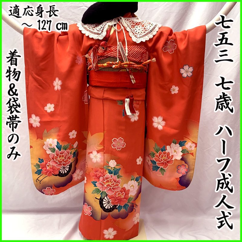 | □七五三 七歳 女児 着物&袋帯&長襦袢 金彩 花車 柔らかい朱色□美品 (No.gd) *こちらの商品は、お着物と&袋帯のみです。柔らかい朱色系の地に、金彩が施された花車文様が優美な7歳七五三のお着物と袋帯のセットです(長襦袢はおまけでお付けしますが、その他の付け衿、ベレー帽はセットに含まれません)。 袴と合わせてハーフ成人式や小学校の卒業式にもご利用いただけます。 お小物類(帯揚げ、帯締め、しごき)は別途3000円、また追加で筥迫と末広は+3000円頂戴します。*お小物類のセレクトはおまかせとまります。 (着物)内揚げが11㎝ございます。左後身頃の裾から、55-57㎝辺りに黒の線跡がございますが遠目から見たらあまり目立ちません。また、八掛に小シミがございますが着用時見えません。 (長襦袢)袖丈の合うものをおまけでおつけいたしますが、中古品のためシミ汚れがある場合がございます(素材はお選びいただけません)。なお半衿は付属いたしません。 (帯)遠目から見たらあまり目立ちません。 【表地素材】(着物)正絹、(帯)正絹 【色】柔らかい朱色系 *モニターによって色味は実際と異なる場合がございます。 【サイズ】(着物) 裄:51cm、肩上げ:3cm、袖幅:30cm、袖丈:74cm、丈(肩から):127cm、腰上げ:0cm、前幅:20cm、後幅:26cm (帯) 幅:27cm、長さ:408cm *素人採寸のため、多少の誤差はご容赦ください。 お求め安い価格での出品ですので、いかがでしょうか? | |