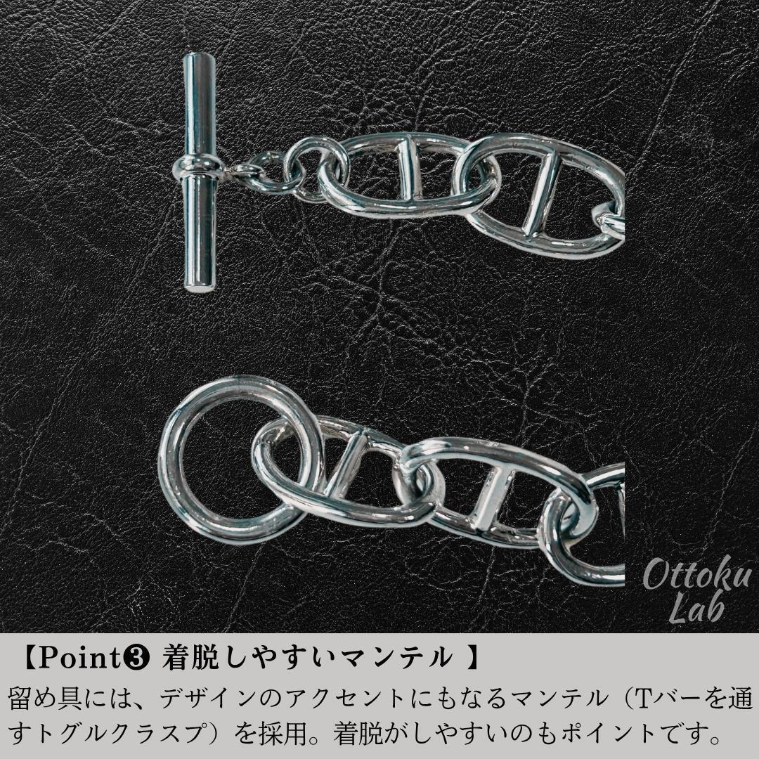 留め具には、デザインのアクセントにもなるマンテル(Tバーを通すトグルクラスプ)を採用。見た目のおしゃれさだけでなく、着脱がしやすいのもポイントです。
