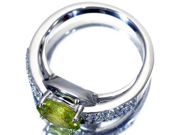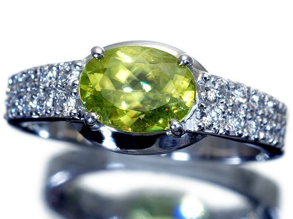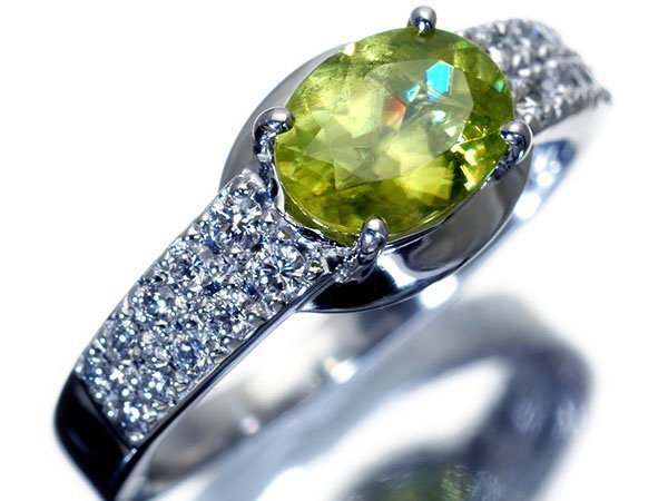 1石で1.66ctと大粒サイズで、美しい透明感に艶麗なイエローグリーンカラーに、虹色の極上のファイアの輝きを魅せてくれる超希少宝石の大粒上質天然スフェーンと、脇には上質な透明感放つダイヤモンドが左右に広がり、キラキラと眩しい輝きでスフェーンを見事に惹きたてています!