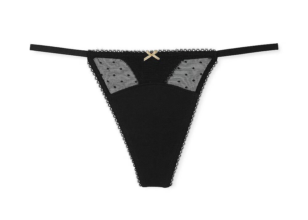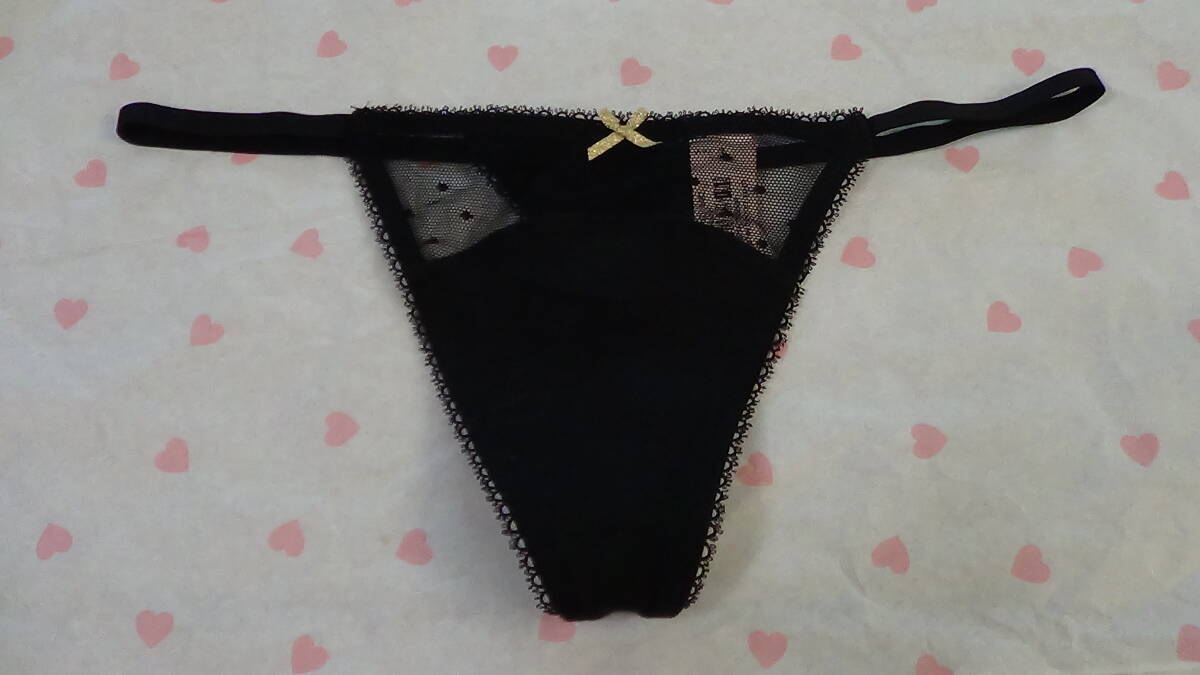 ・色:黒。フロント上部分は黒のメッシュにドット柄。ゴールドのリボン付き。