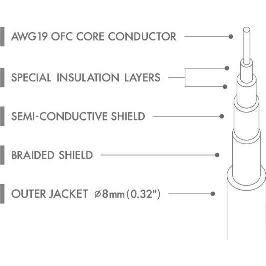 半導電性シールドの周りに編組形状のOFC(OxygenFree Copper/無酸素銅シールドを巻くことで、高いノイズ耐性を発揮します。