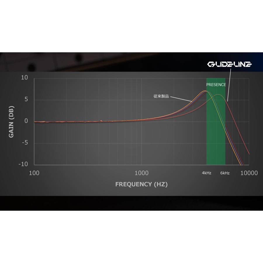 従来の3製品は4kHz付近の周波数帯からピークが下がっていますが、一方でGLIDELINEは5kHzを超える帯域までピークがあります。