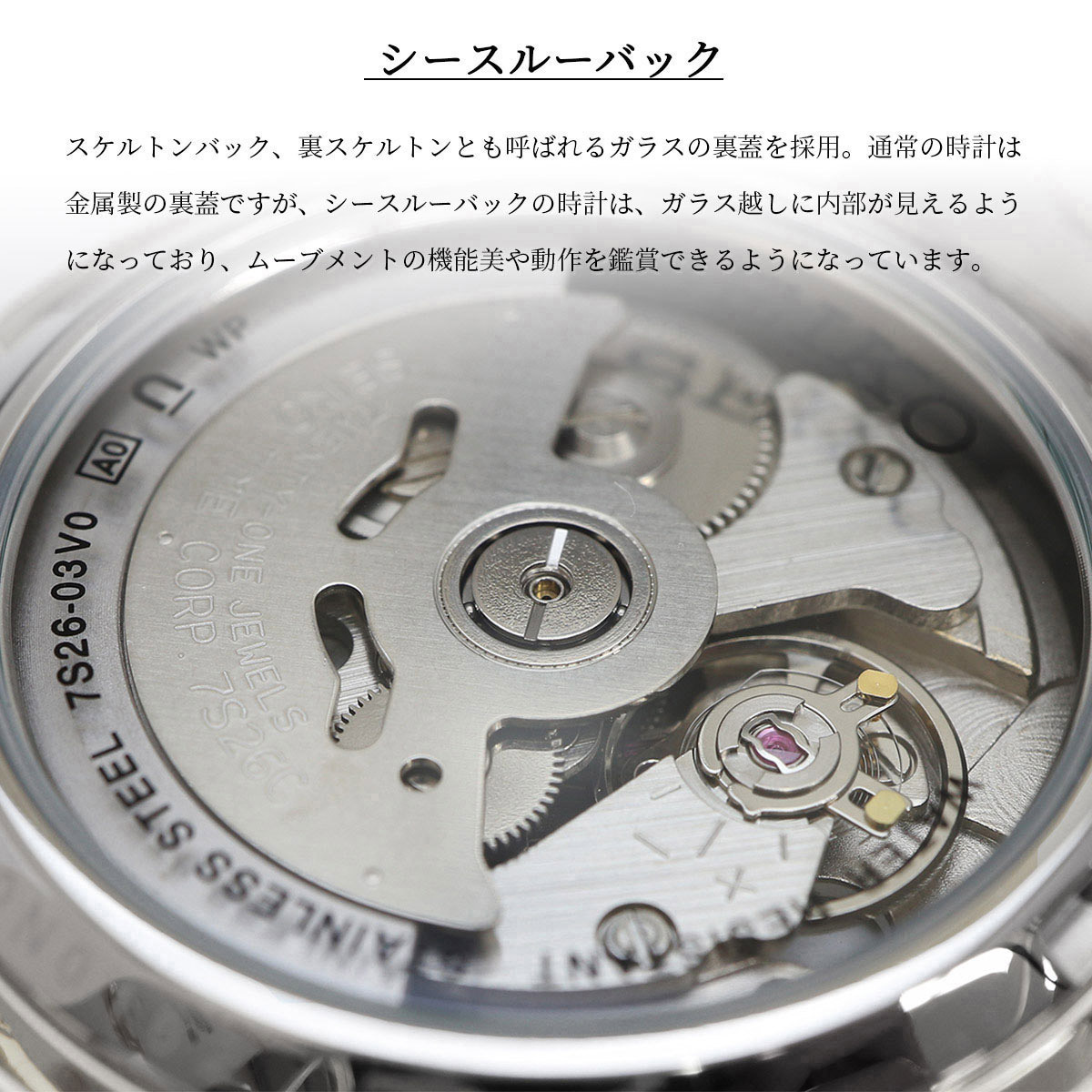 ムーブメント (時計の機械) | ・7S26 (自動巻、手巻き機能なし) ・日差:プラス45秒からマイナス35秒の範囲 ・リューズを引くことで針を止める秒針停止機能はついていません。 |