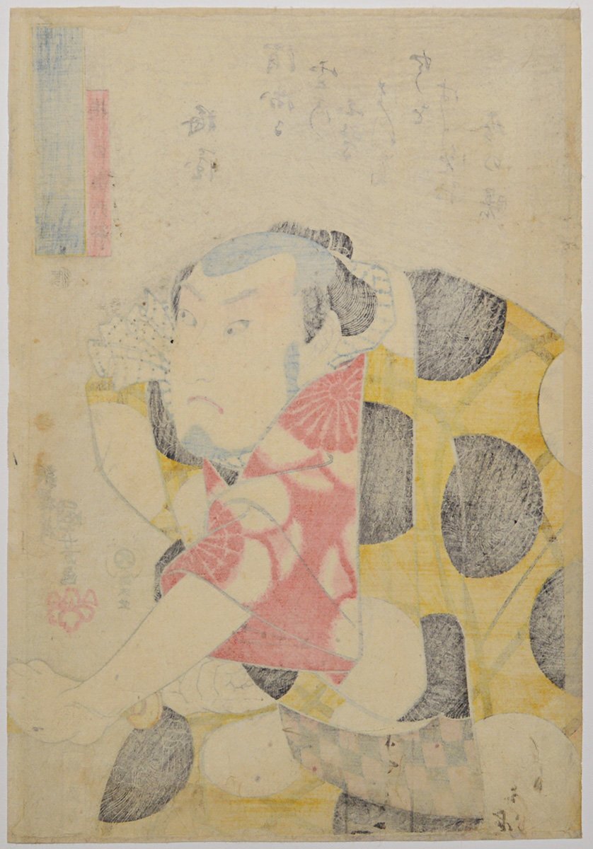 歌川国芳の浮世絵です。 「国芳もやう」は国芳がデザインした模様の衣服 「正札附現金男」は掛け値なしの侠客という意味と言われています。 梅の由兵衛といえば白鷺と烏の模様の着物を着ていますが 本作の工夫で、烏鷺とは囲碁のことでもありますので 碁盤と碁石の模様に白鷺と烏が描かれています。 上部には梅の屋鶴寿の賛があり 「梅屋 消残る 雪の 白鷺 はつ烏 今を はしめの 春の曙」 と記されています。 初烏は元日の季語 「今を初めの旅衣」は由兵衛が頭巾を取るときのセリフ 春の曙も由兵衛ものの題名に使われる言葉ですので 由兵衛関連の語句を集めて新春を寿ぐ狂歌となっています。 古いもののため経年の傷みあります。 絵師 歌川国芳 寸法 大判 サイズ縦約36cm×横約24.8cm 状態 トリミング 汚れ 制作年 弘化2年頃 |