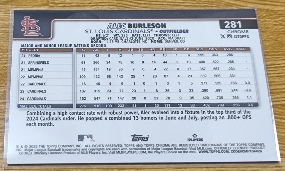A265: アレク・バールソン Alec Burleson MLB topps chrome 2025 baseball 281 ベース