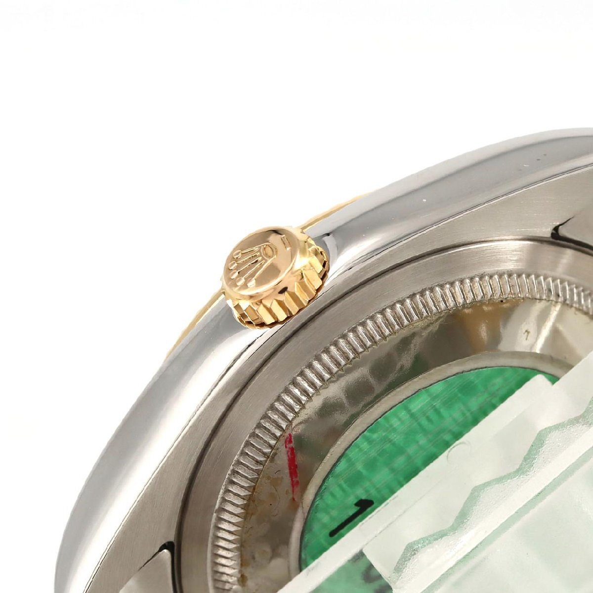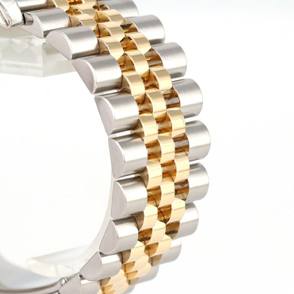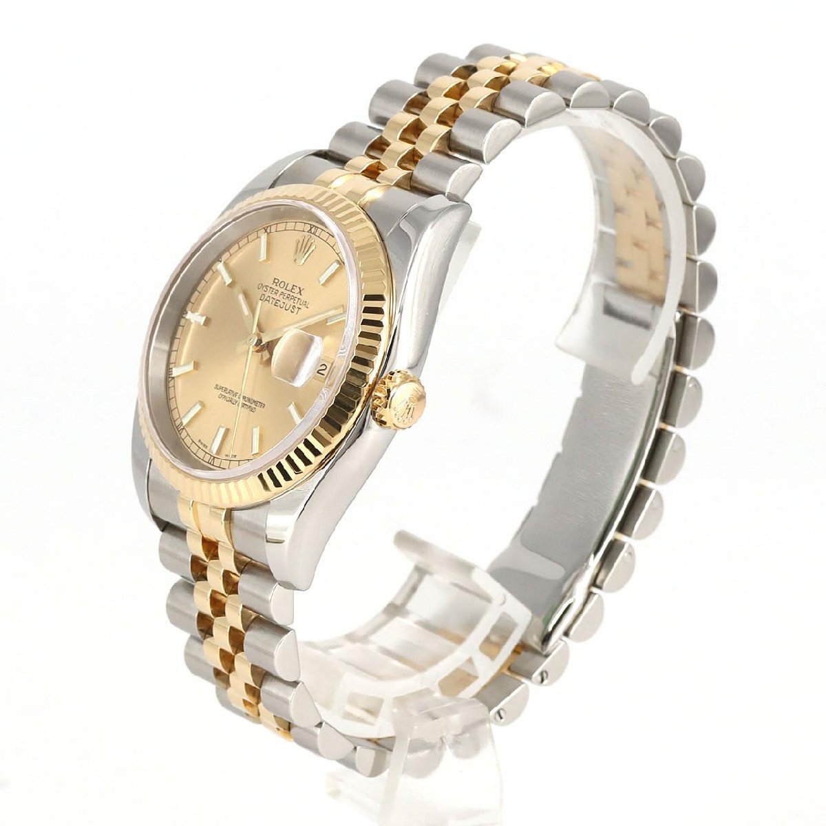 1945年に登場して以来、ロレックス伝統のモデルとして存在する「デイトジャスト」。防水ケース・自動巻ムーブメント・日付表示機能を備えており、まさに時計史に残る実用高級時計の金字塔モデルです。こちらのRef.116233は、2004年にホワイトゴールドコンビモデルやステンレスモデルに先駆けてモデルチェンジを果たしたイエローゴールドコンビモデルです。一世代前モデルの16233ではヘアライン仕上げとなっていたケース表面部分は鏡面仕上げへと変わり、より光沢感のあるモデルになりました。また、ブレスは、フラッシュフィットが一体型となり、中央部分のコマは巻き板タイプ(中空)から、無垢タイプへと変わりました。こうしたことで強度、耐久性が向上しました。バックル部分は、ハイクラスモデルのデイデイトに採用されている、コンシールドクラスプが採用され、あたかもバックルがないようなスマートなシルエットに。一層エレガントな印象が強くなりました。その中でもこちらは、豊富なバリエーションを誇るデイトジャストのダイヤルの中で特に人気が高いゴールド文字盤です。