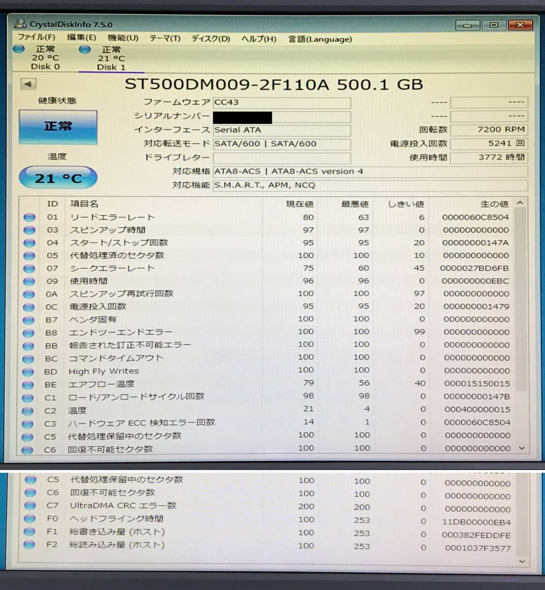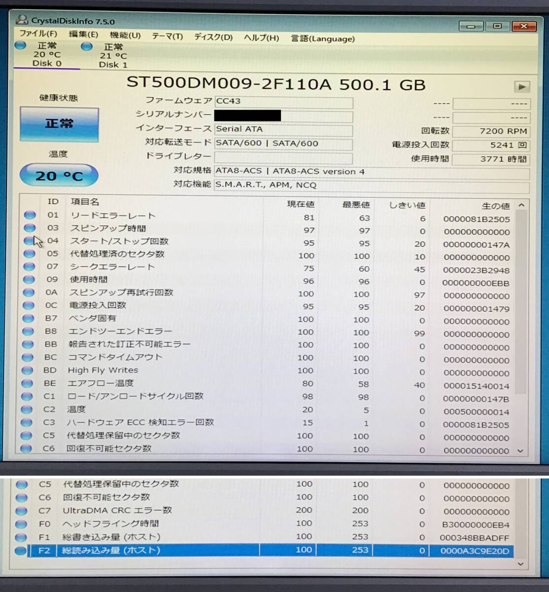 【HDD】500GB×2(出品前の時点での使用時間:片方 3772時間、片方 3771時間)