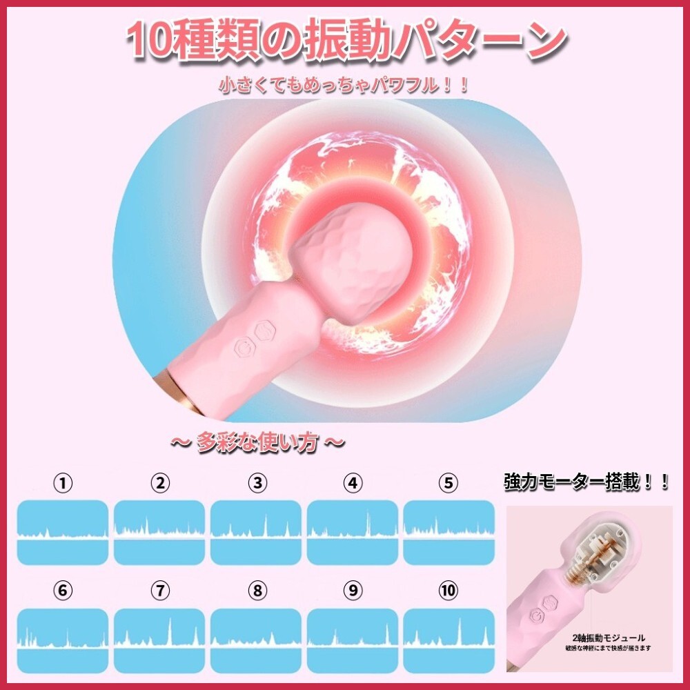・【10種振動パターン】 10つの振動パターンと振動数が全身に広がり凄い快感を体験するこができます。普通の電マより強いパワーがあり、改良な強力モーターが搭載しています!デンマヘッドは強力鬼振動で、下半身から全体を満たすほどの気持ち良さ !振動パターンを自由に切り替えることができて、操作もとても簡単です。