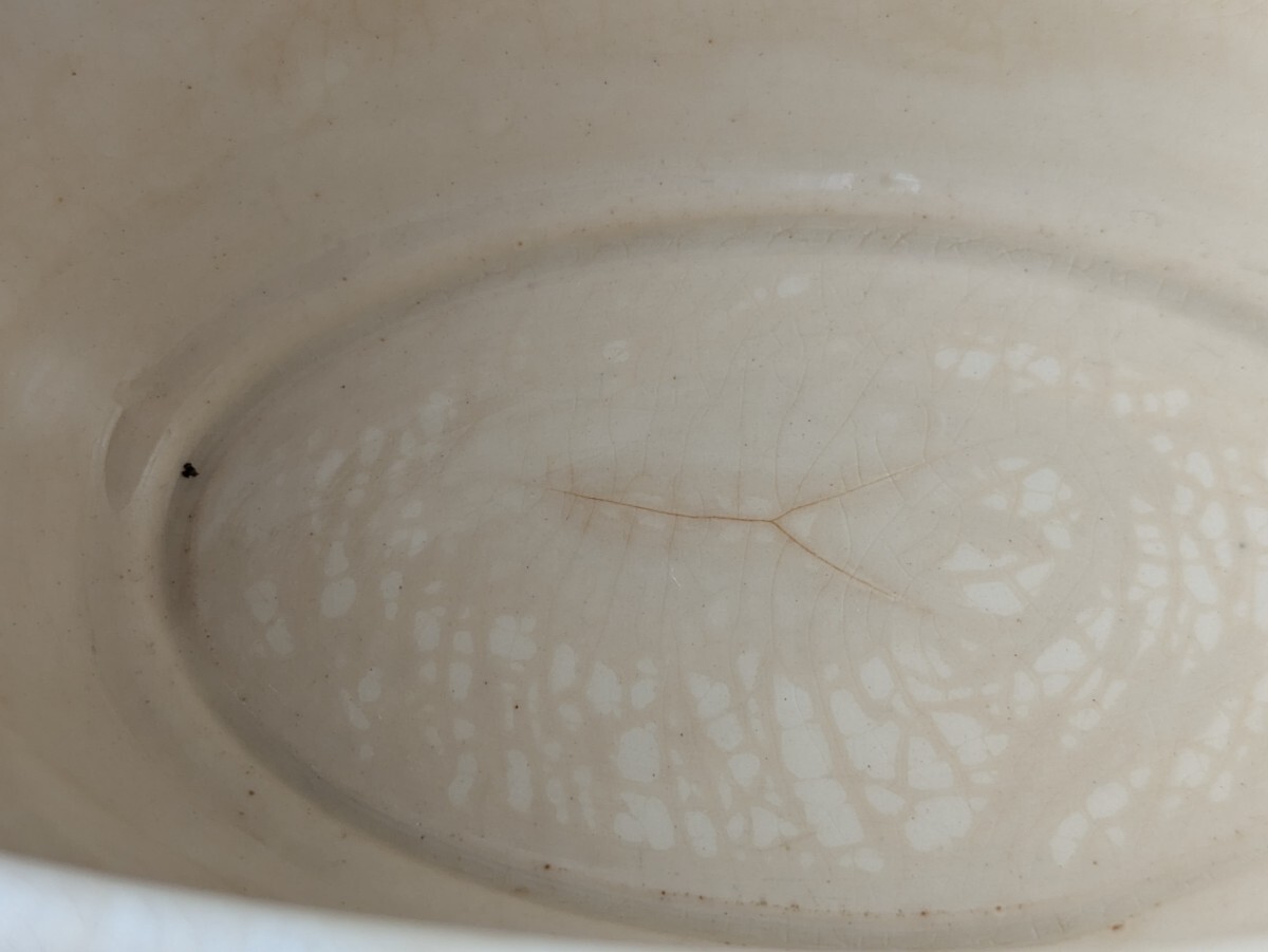 全体に釉薬への貫入や染みがございます。カップ内側Y字に傷がございますので画像にてご確認ください。ヒビの類ではないので普段使いしていただけます。