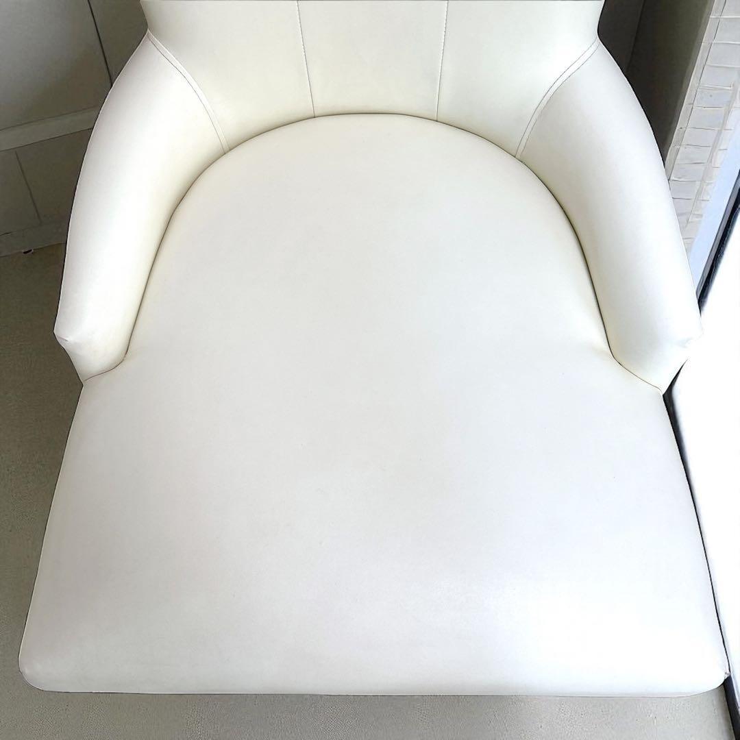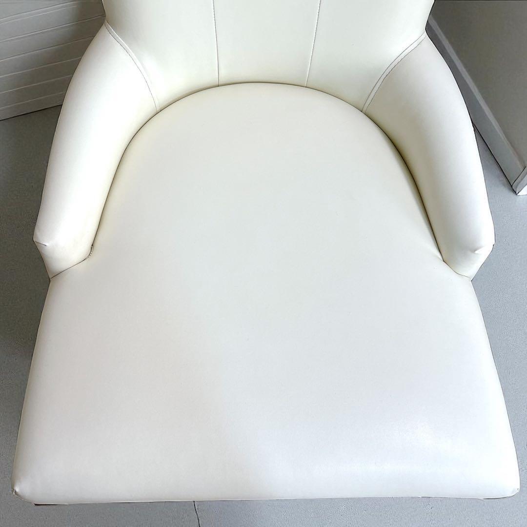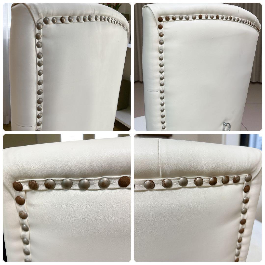 ホワイトのレザー調張地に、ボタン留めのクラシカルなデザイン。背面には鋲打ち装飾とリング取っ手付きで、どの角度から見ても高級感があります。