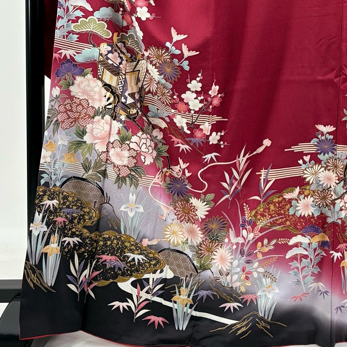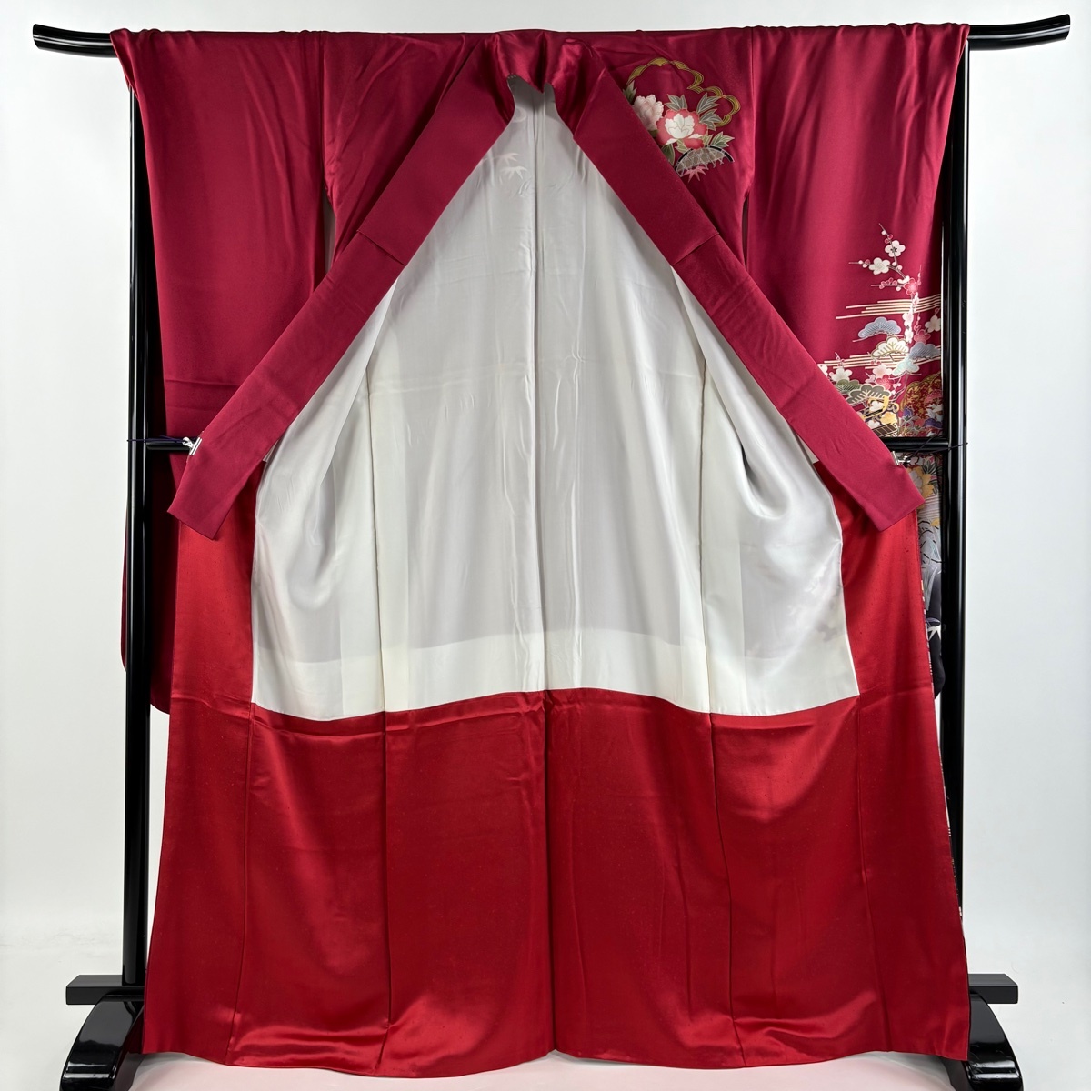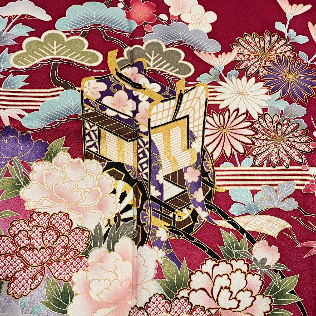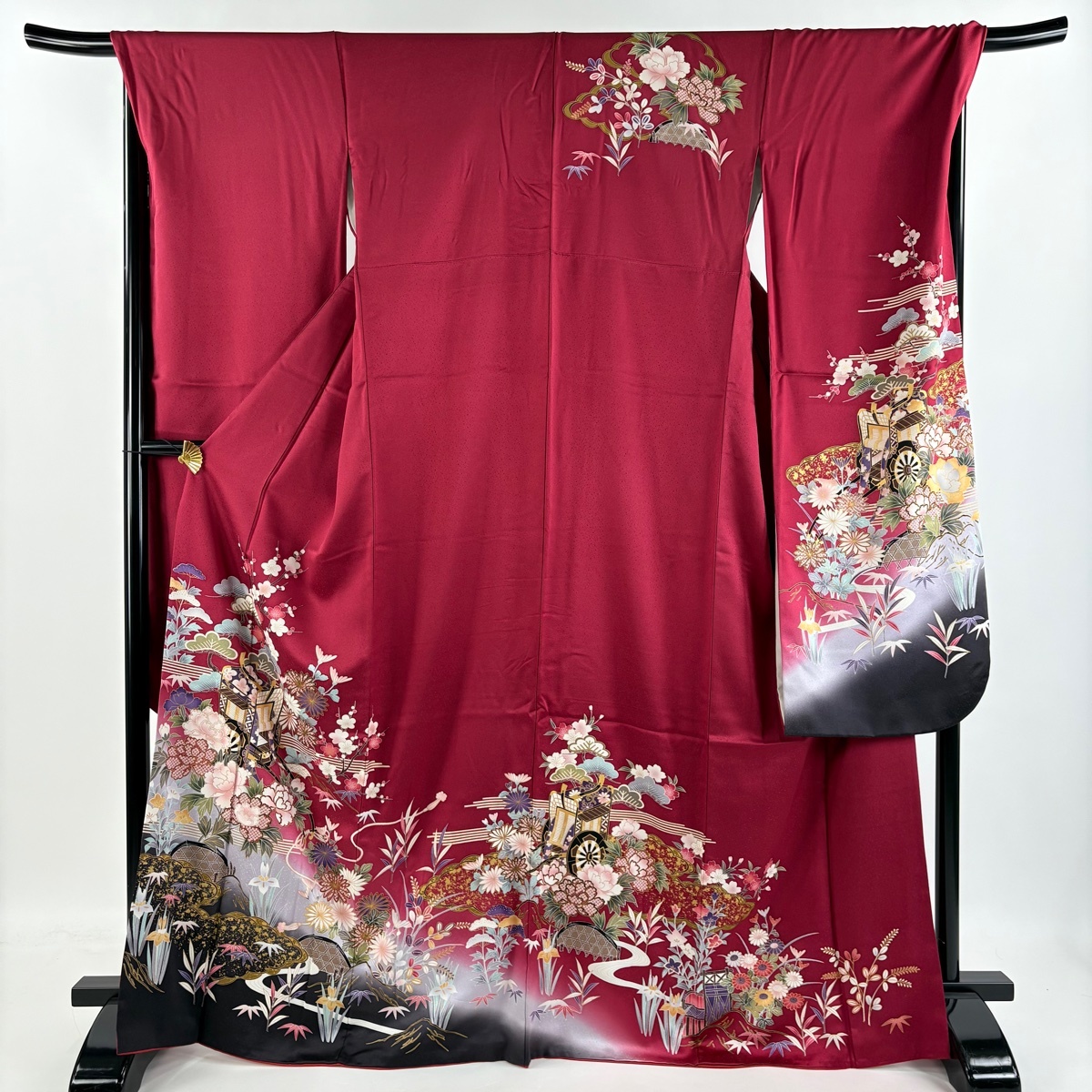 振袖 秀品 御所車 松竹梅 金彩 ぼかし えんじ色 袷 身丈168 裄丈69.5 L 正絹 【中古】 |