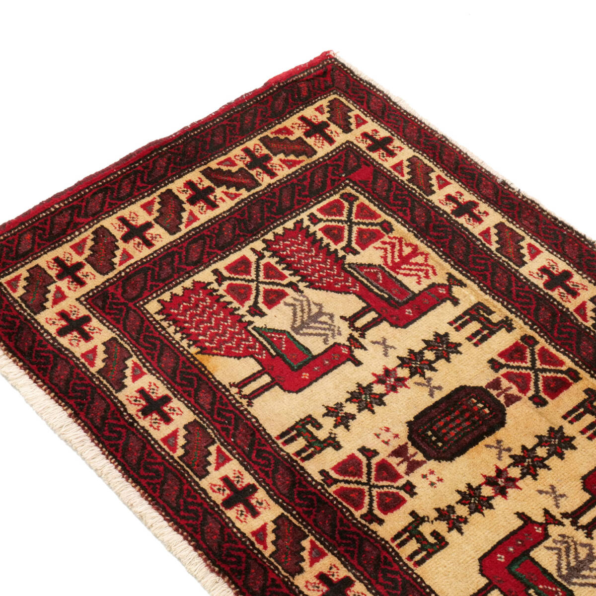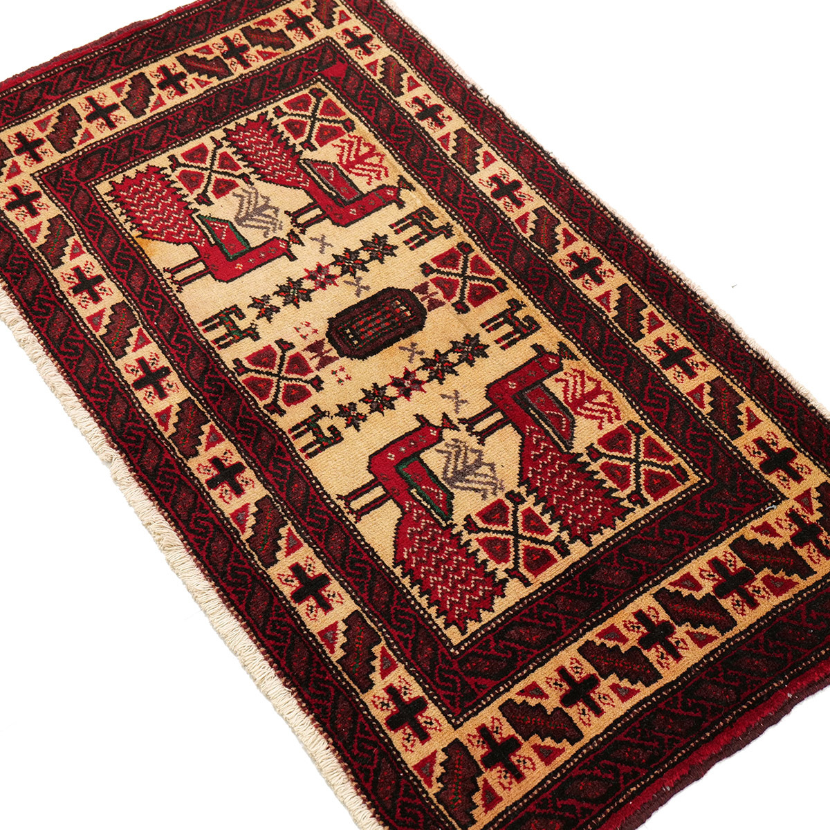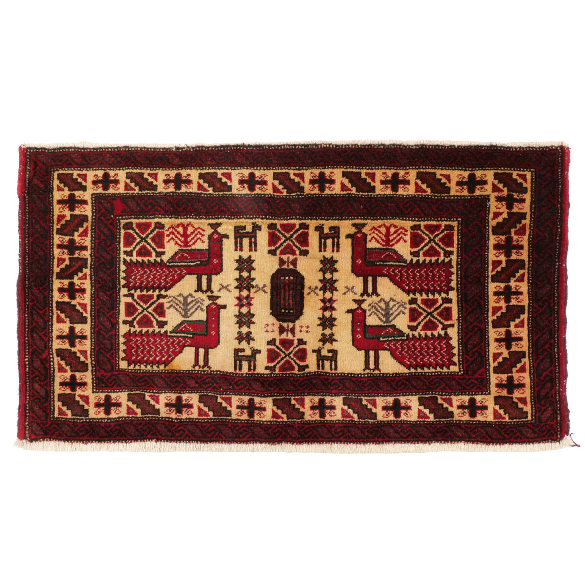 1970年代にイラン北東部トルバトジャムで織られたセミアンティーク絨毯です。生成りのフィールドに赤く描かれた鳥が堂々と配され、周囲には鹿や幾何学模様が整然と並ぶ独特のデザインが目を惹きます。遊牧民の生活と自然を映し出すような意匠は、工芸品としての価値とともに民俗芸術の一端を感じさせます。