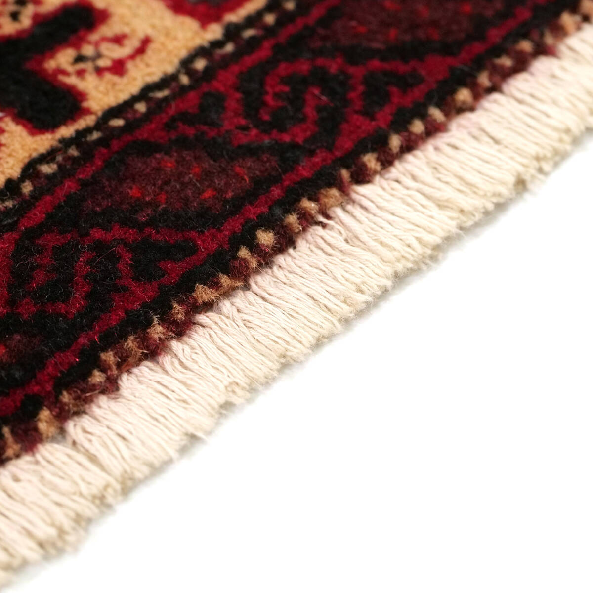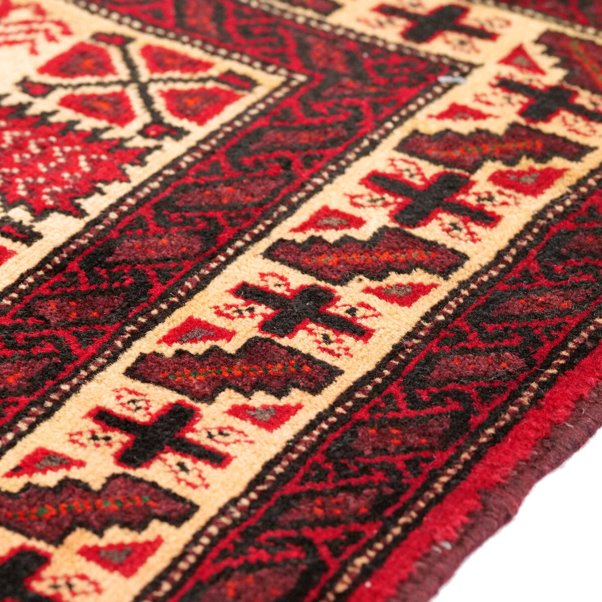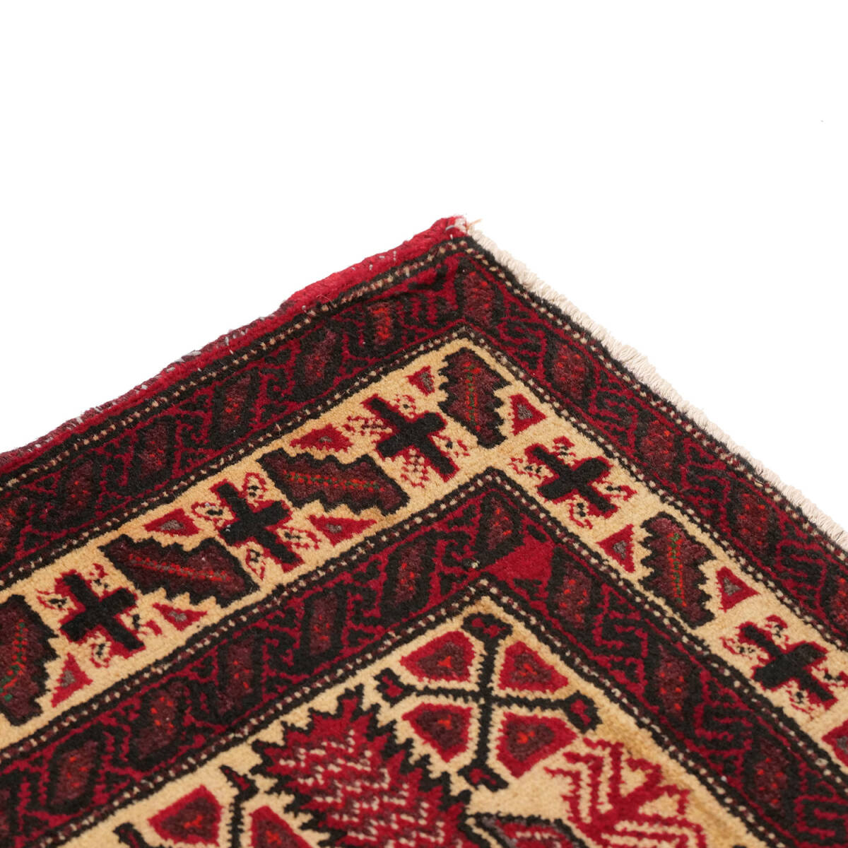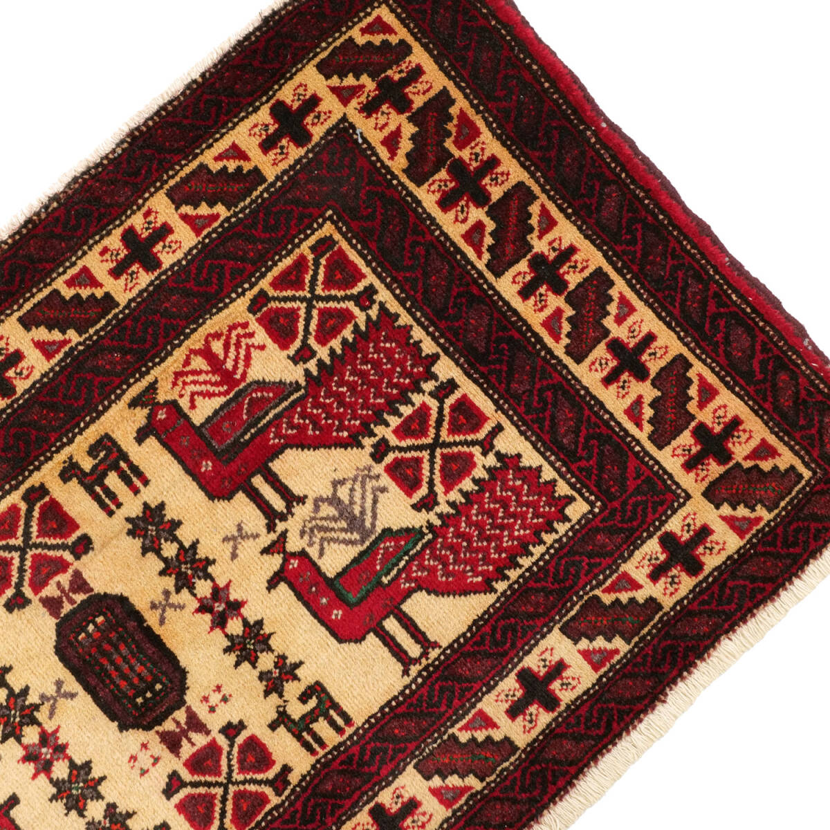 1970年代にイラン北東部トルバトジャムで織られたセミアンティーク絨毯です。生成りのフィールドに赤く描かれた鳥が堂々と配され、周囲には鹿や幾何学模様が整然と並ぶ独特のデザインが目を惹きます。遊牧民の生活と自然を映し出すような意匠は、工芸品としての価値とともに民俗芸術の一端を感じさせます。