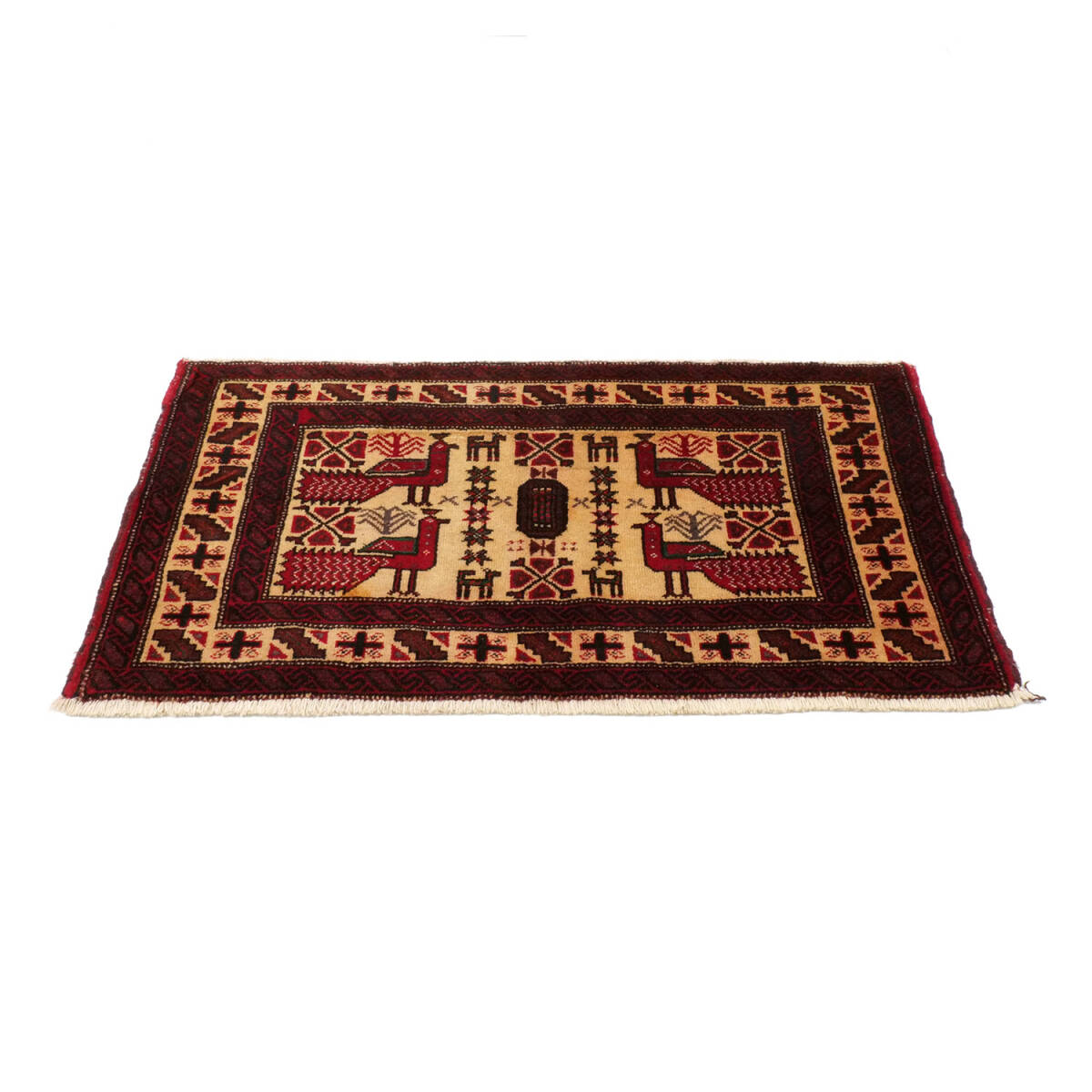 生成りのフィールドに深紅の鳥が映え、黒と茶のアクセントが全体を引き締めます。素朴ながらも力強い配色で、空間に印象的な存在感を与えます。