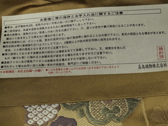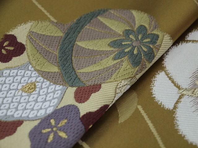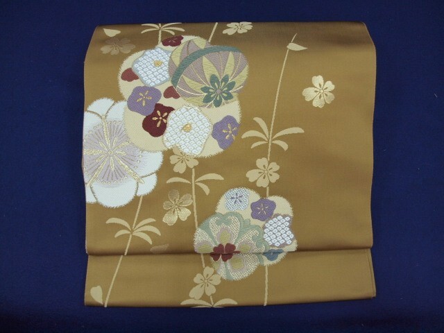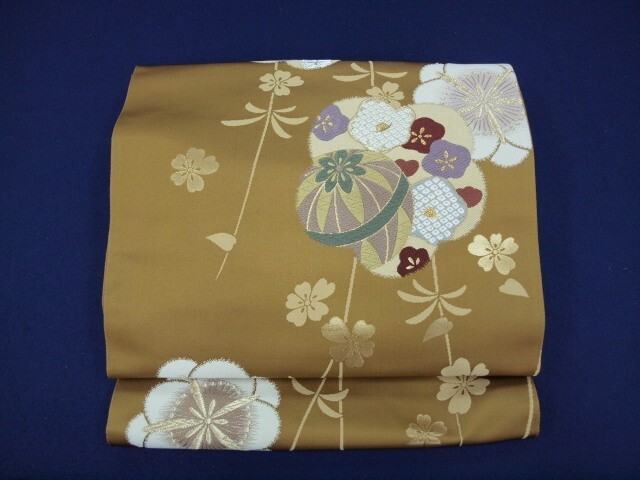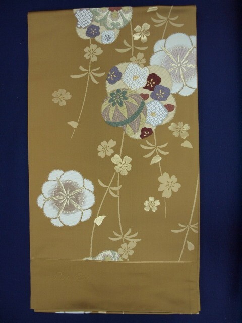 振袖から訪問着・色無地いろいろのお着物にお使いいただける袋帯です桑茶系の黄土色に手毬や花柄をあしらった上品でかわいらしい袋帯です。未仕立てですので お仕立てまで2週間以上かかります。<素材>絹95% ポリエステルその他5%<西陣証紙番号>西陣証紙No.:353「高島織物」謹製☆実物とは接写の加減で色が多少異なる場合がございますのご了承の上落札して下さい*実店舗がございますのでご覧になりたい方は御連絡お願いします。*発送・ご連絡は 土曜・日曜・祝日はしていませんので御了承のほどお願いします。
