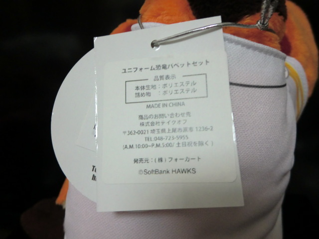ソフトバンク ホークス ユニフォーム 恐竜 翼竜 ハンドパペット パペット人形 未使用品