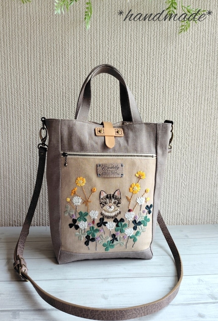 ベージュのコットン生地にお花とこねこちゃんの刺繍を施したトートバッグを作製しました