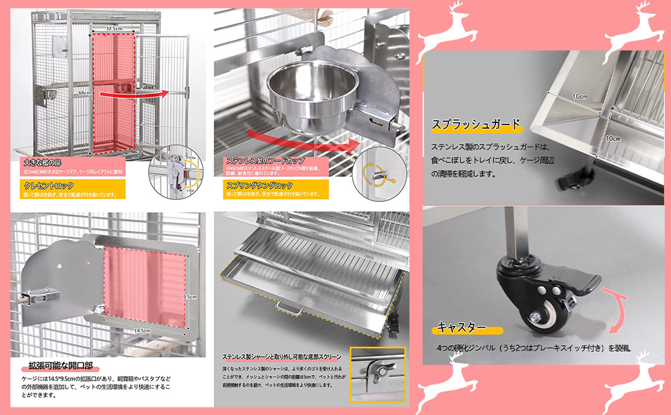 【ステンレス製シャーシと取り外し可能な底部スクリーン】大型 鳥ケージ 深くなったステンレス製のシャーシは、より多くのゴミを受け入れることができ、メッシュとシャーシの間の距離は5cmで、ペットと汚れが直接接触するのを避け、ペットの生活環境をより快適にします。ステンレス製のスプラッシュガードは、食べこぼしをトレイに戻し、ケージ周辺の清掃を軽減します。