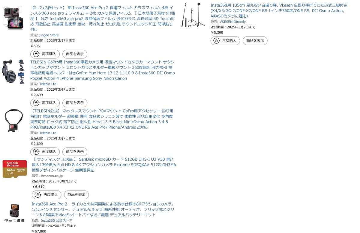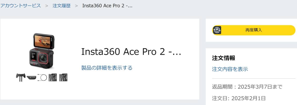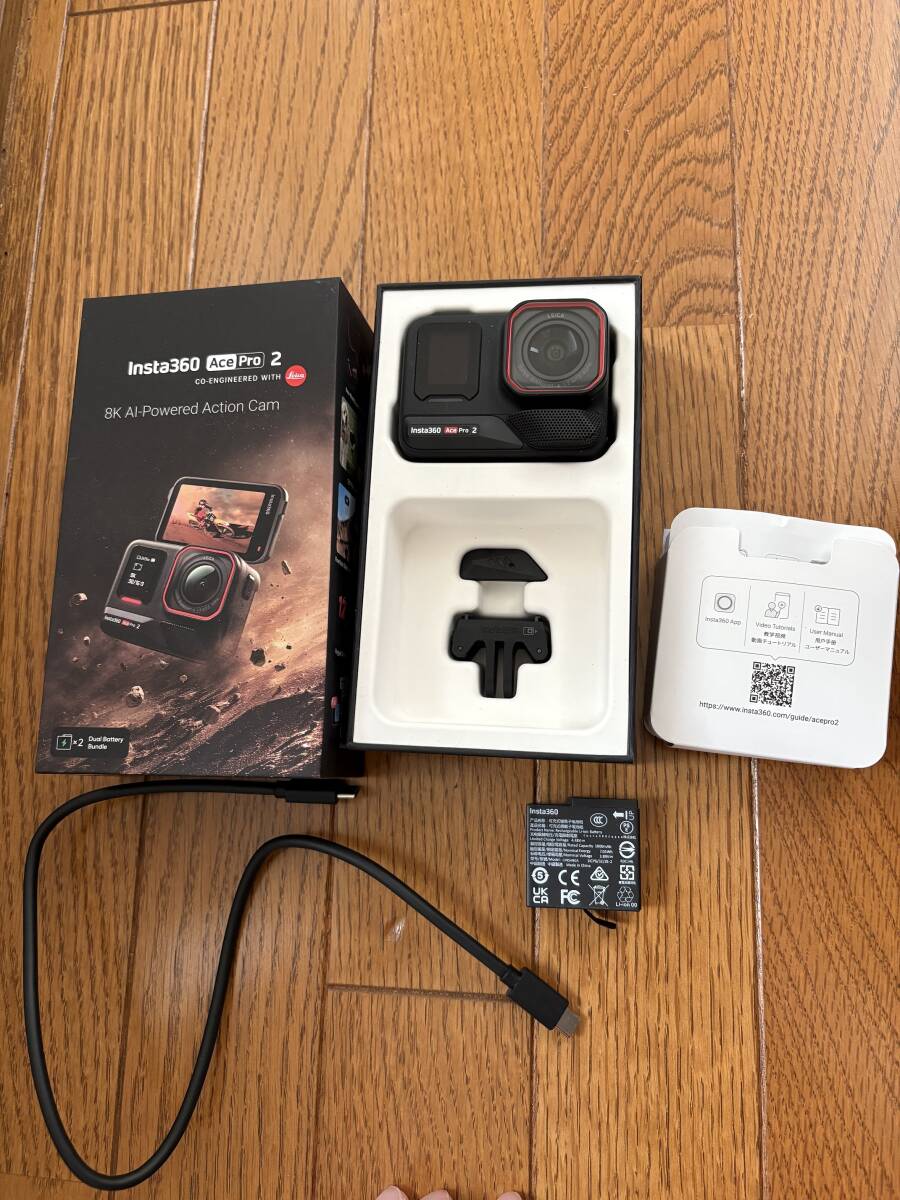 Insta360 Ace Pro 2 デュアルバッテリーキット (ブラック) insta360の中古品を出品致します。購入日は画像8のとおり2025年、2月1日にアマゾンにて通販で購入致しました。一回使用後、使用する機会がなく暗所に閉まっていたので特に大きな傷もなく美品です。起動も問題なしです。バッテリーはデュアルキットなので2つあります。おまけとして画像7の本体と一緒に購入したmicroSD カード 512GB、自撮り棒、ネックレスマウント