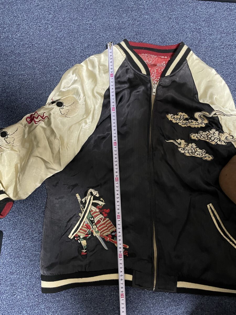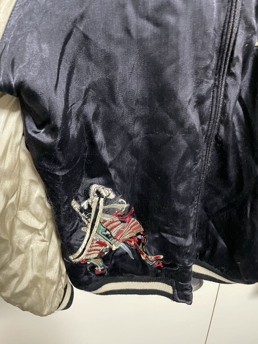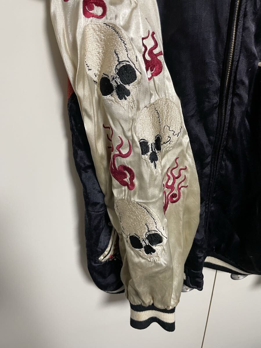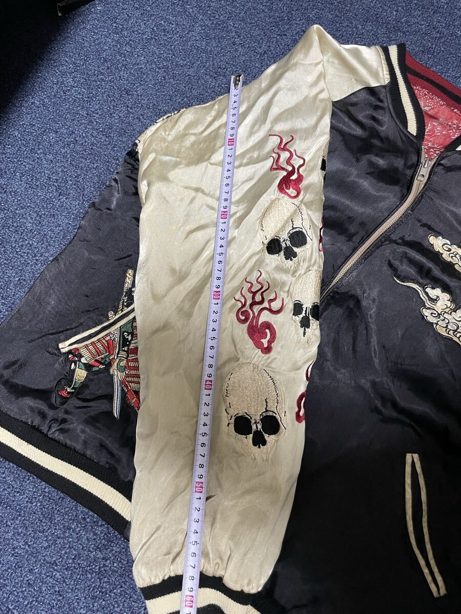 迫力のある武士と雲の刺繍、両袖には炎のドクロ刺繍が施されたスカジャンです。