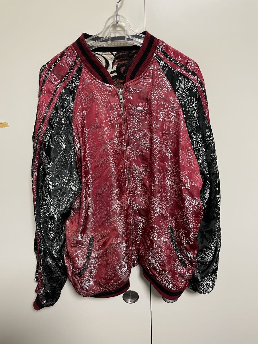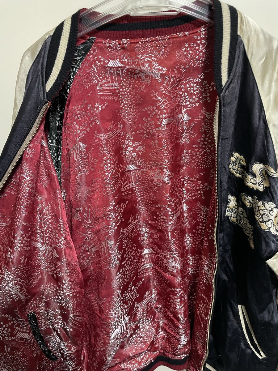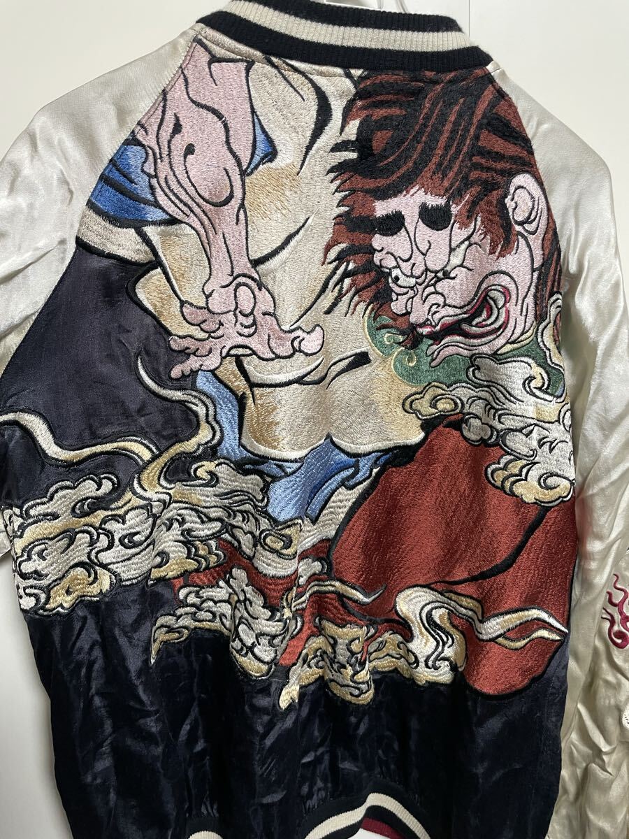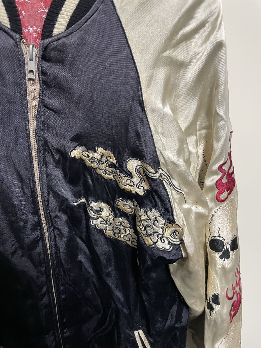 迫力のある武士と雲の刺繍、両袖には炎のドクロ刺繍が施されたスカジャンです。