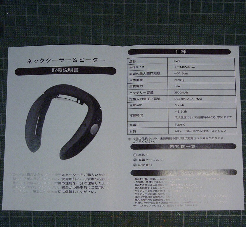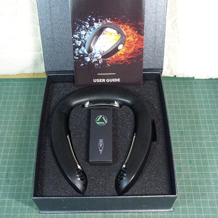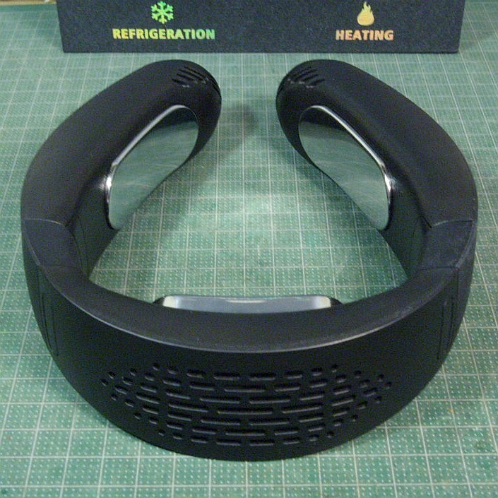 ペルチェ素子の冷却(冷温両用)プレートは、後ろに1枚、両側に各1枚、合計3枚で、冷却調整は3段階です。スイッチを入れて2秒くらいで冷たくなります。後ろと左右に排熱用の吹き出し口があります。扇風機の機能はありません。上下の違いの少ないデザインで、自分の首の傾きに合わせて上下を選択することができそうです(説明写真でも上下が決まっていないようです)。かなり首に密着させることができますが、軽量283g(実測)で、首に負担がかかりません。バッテリーの容量は3500mAhと記載されています(容量が足りない時には、モバイルバッテリーの使用ができるようです)。