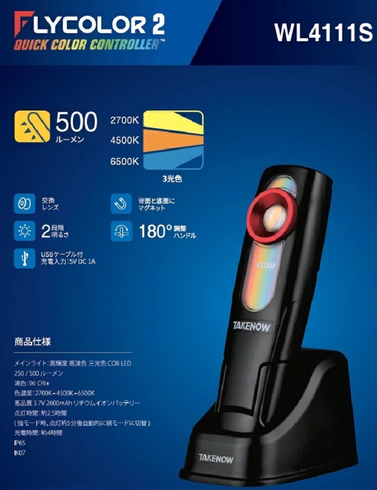 TAKENOW WL4111S 充電式カラーマッチLEDライト/COLOUR MATCH Work light  USBケーブル/充電スタンド付