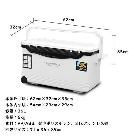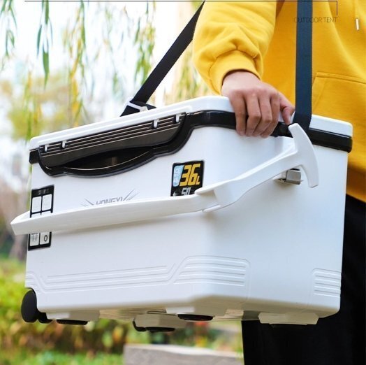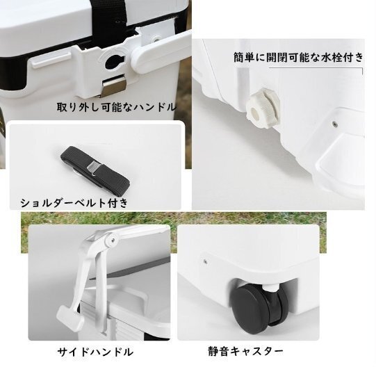 釣り用クーラーボックス 容量36L 座れる頑丈マッスルボディ 防水 サイドハンドル キャスター付き 肩ベルト付き 保温150h 水栓付き 白&黒