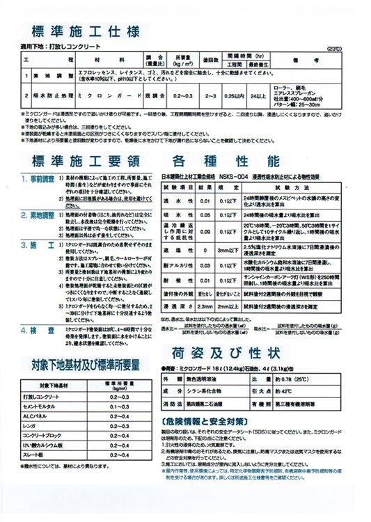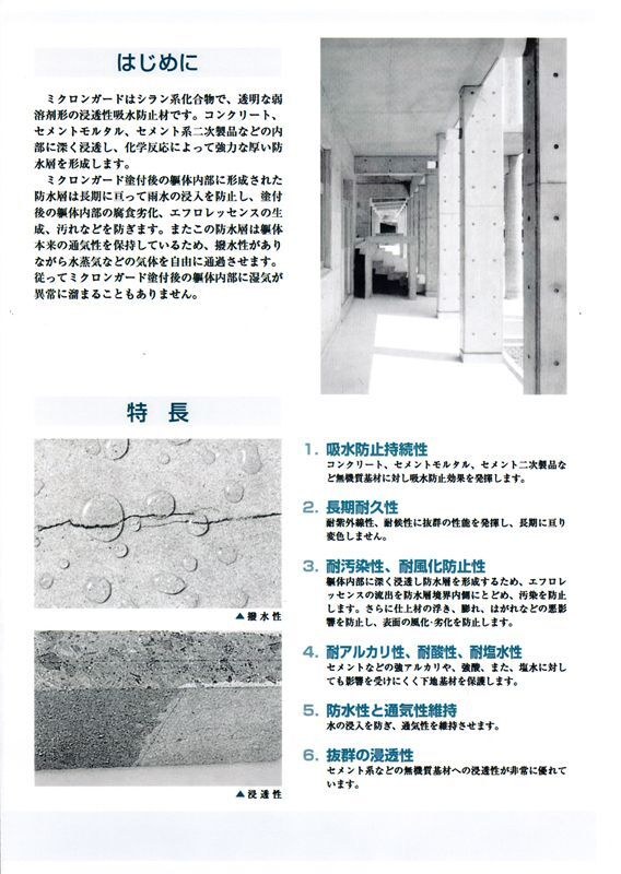 ミクロンガードはシラン系化合物で、透明な弱溶剤形の浸透性吸水防止材です。