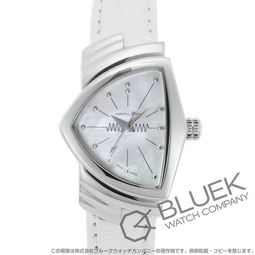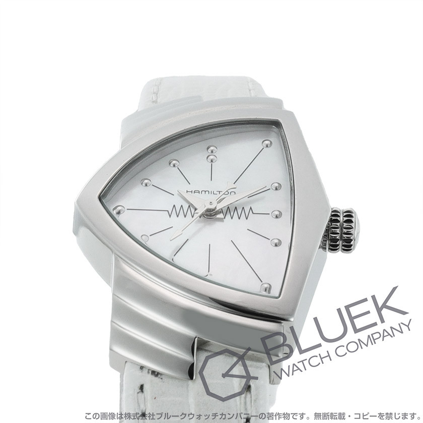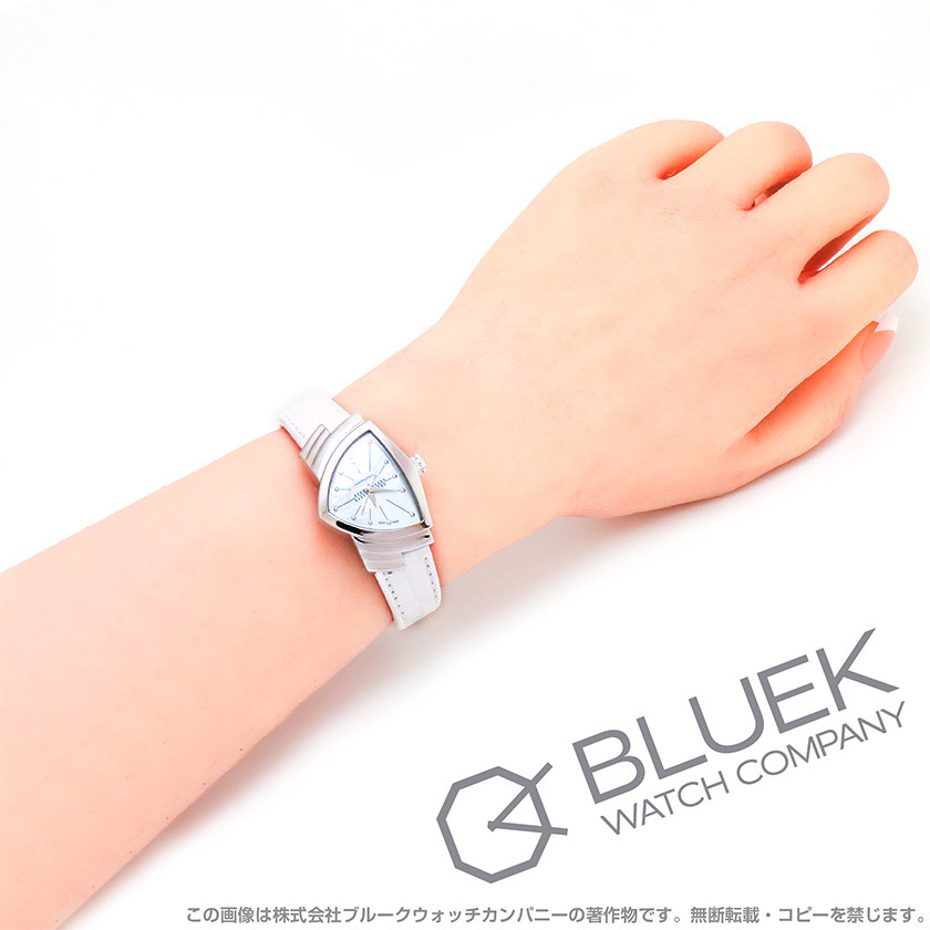 時計の歴史を変えたベンチュラは1957年に登場し世界初のエレクトリックウォッチとしてスミソニアン博物館に永久展示されているハミルトンの傑作。キャデラックのデザイナーで「インダストリアルデザインの鬼才」と称されたリチャード・アービブによる盾形モチーフの独創的な三角形フォルムが特徴で人気なロングセラーモデル。中でも小ぶりで女性らしいサイズのこのベンチュラはホワイトシェルダイヤルに発売当時と同じエレクトリックデザインを受け継ぎ、ハンドメイド仕上げのホワイトレザーベルトも魅力です。 |