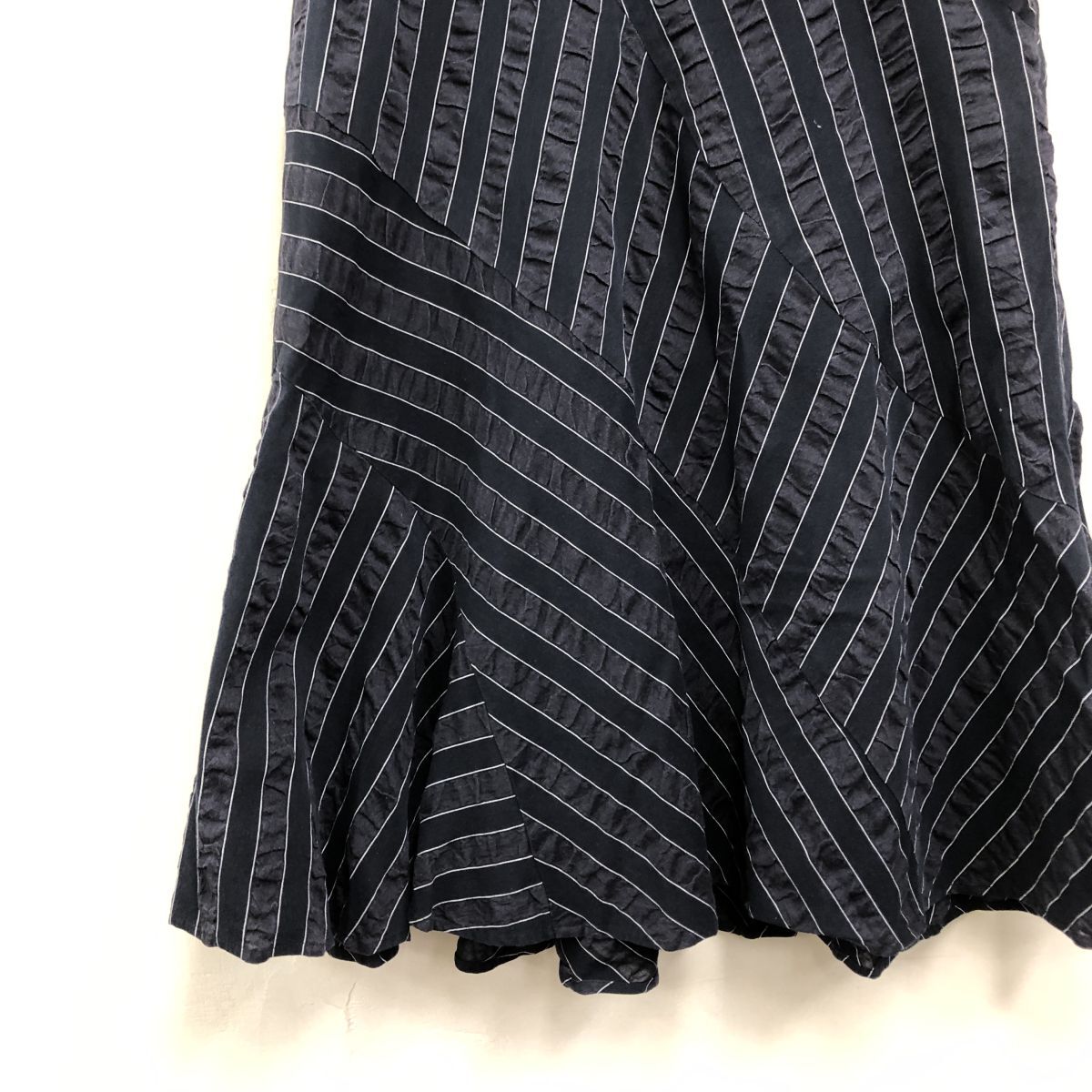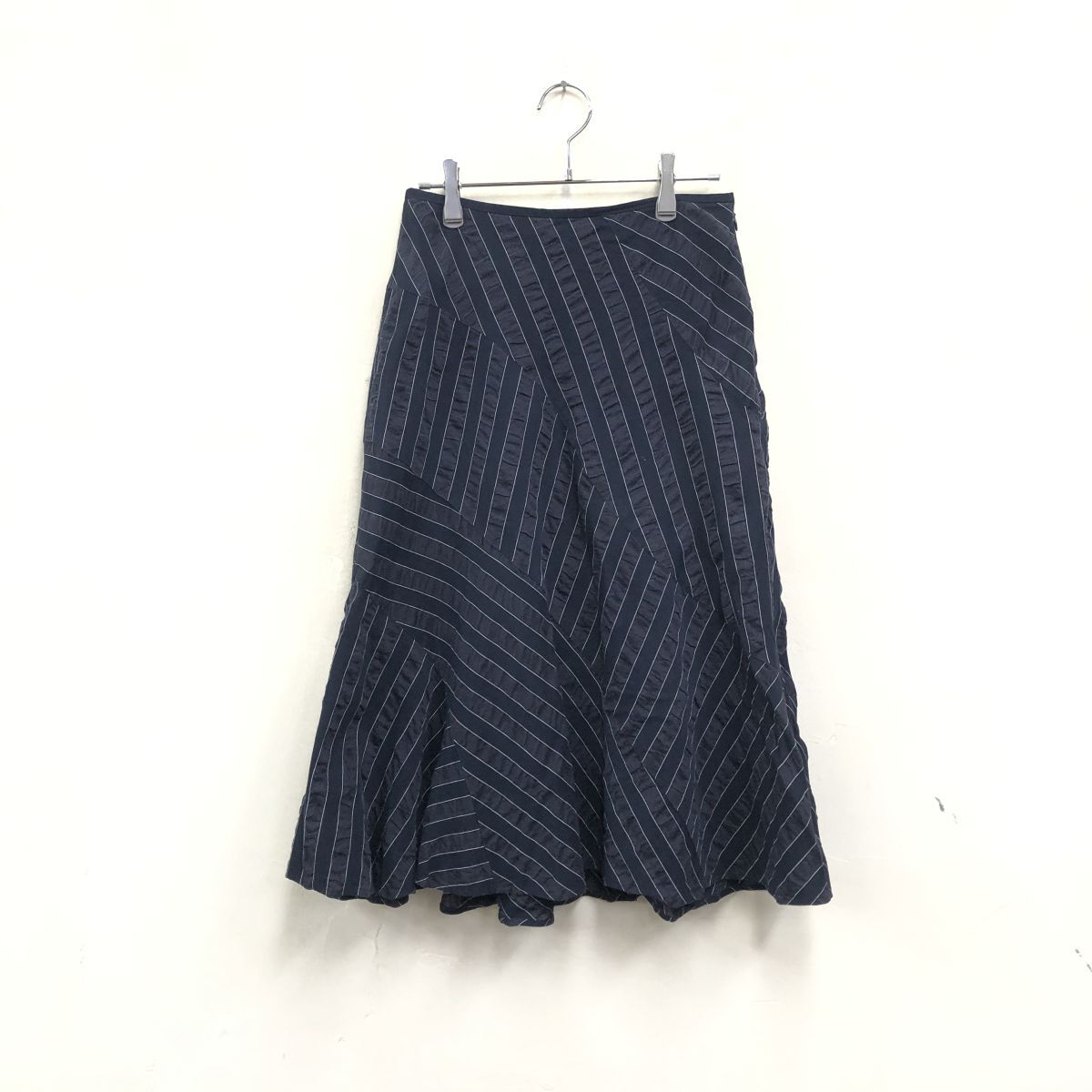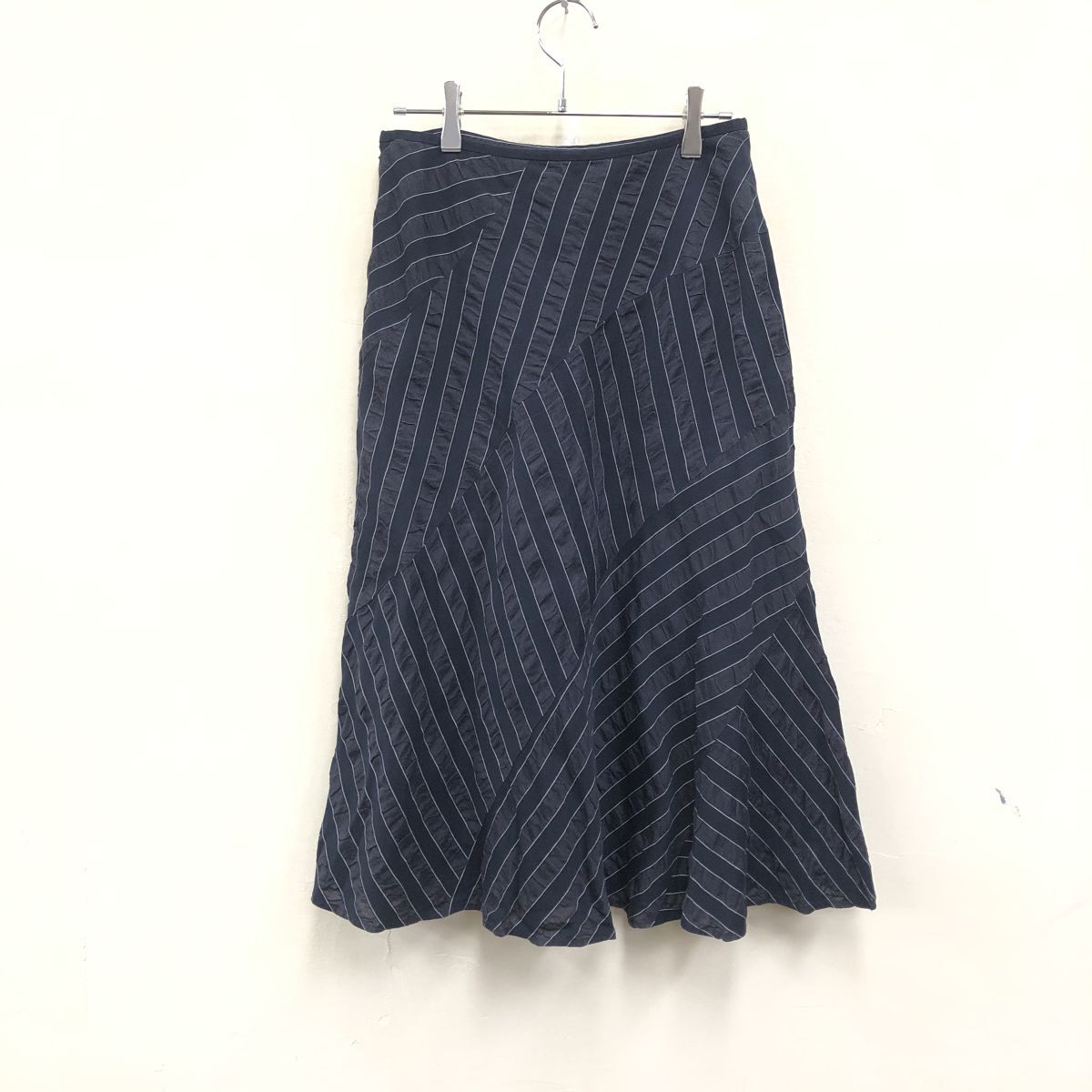 2H2033-Y◆ICB アイシービー フレアロングスカート 切り替えデザイン ストライプ ボーダー リネンブレンド レディース◆size9 ネイビー 綿