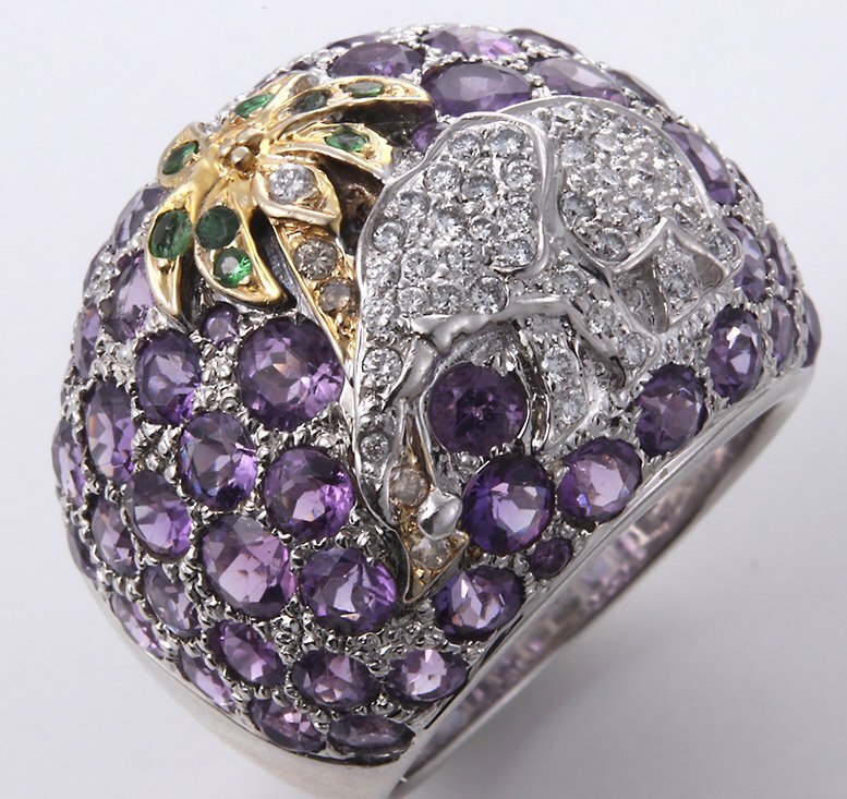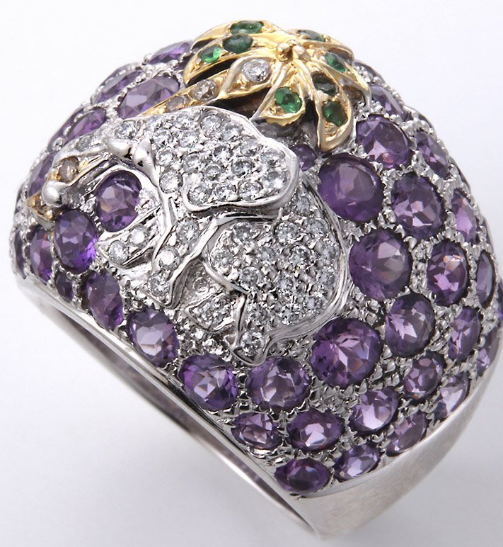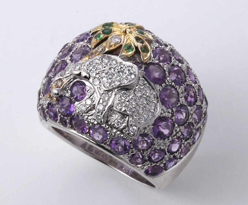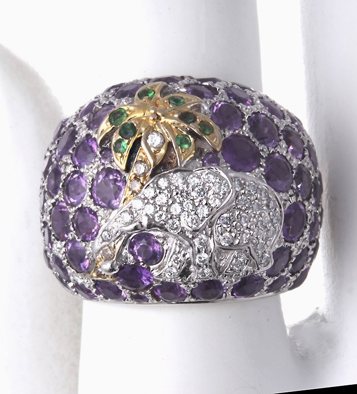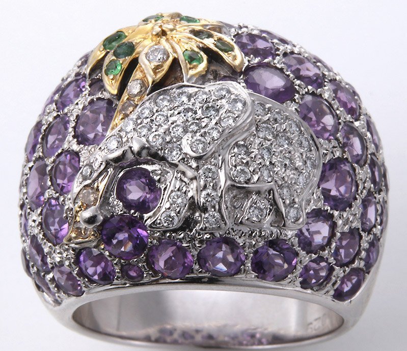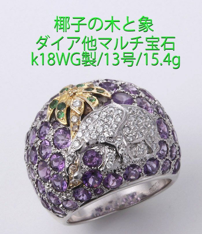 コメント | [[全ての商品に品質保証カードが付きますのでご安心ください]]アメシストとグリーンガーネット+ダイアで構成されたk18WG製の13号リングです。トップ部分の最大幅が19.7ミリと、かなり大型のリングです。描かれているのは、椰子の木と象です。東南アジアでは神の化身として崇められている象ですので、幸運のリングかも知れません。とても良いコンディションです。 |