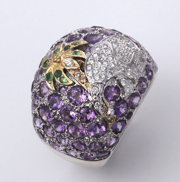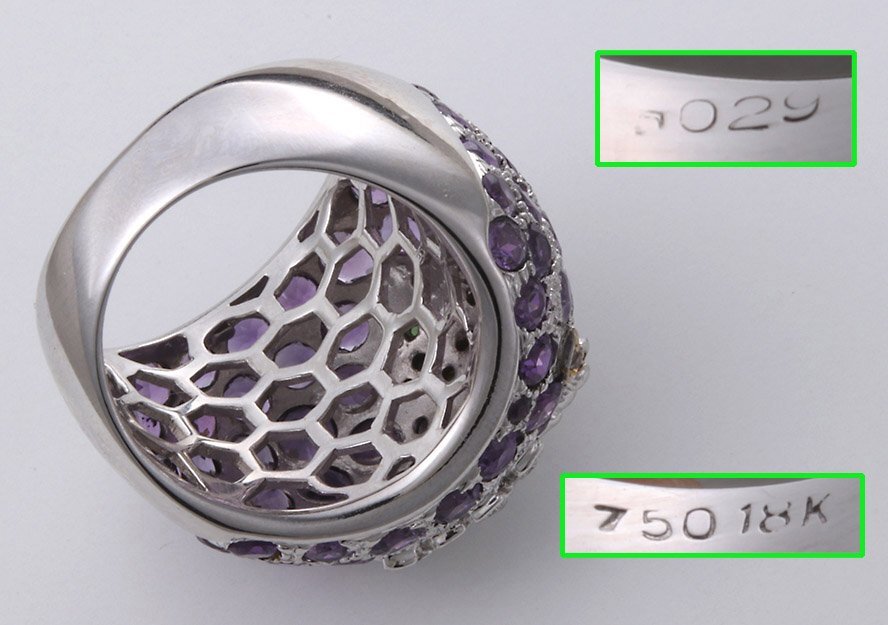 マテリアル | 天然ダイア合計0.29カラット(カラット刻印あり)、天然アメシスト、グリーンガーネットいずれもカラット刻印なし、k18ホワイトゴールド製(一部はイエローゴールド) |