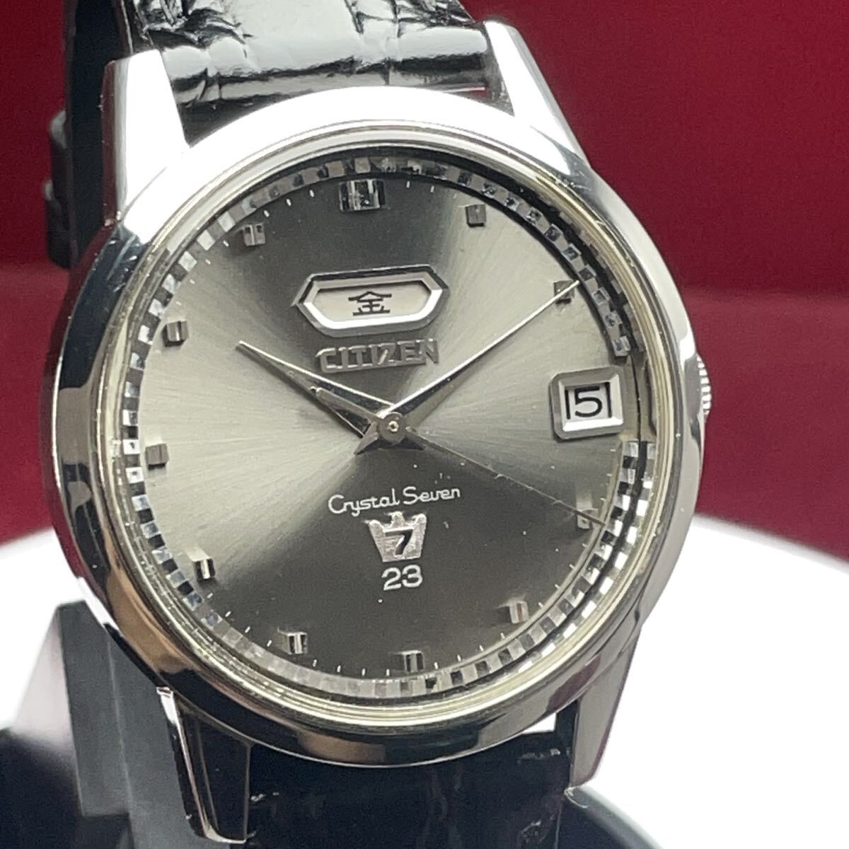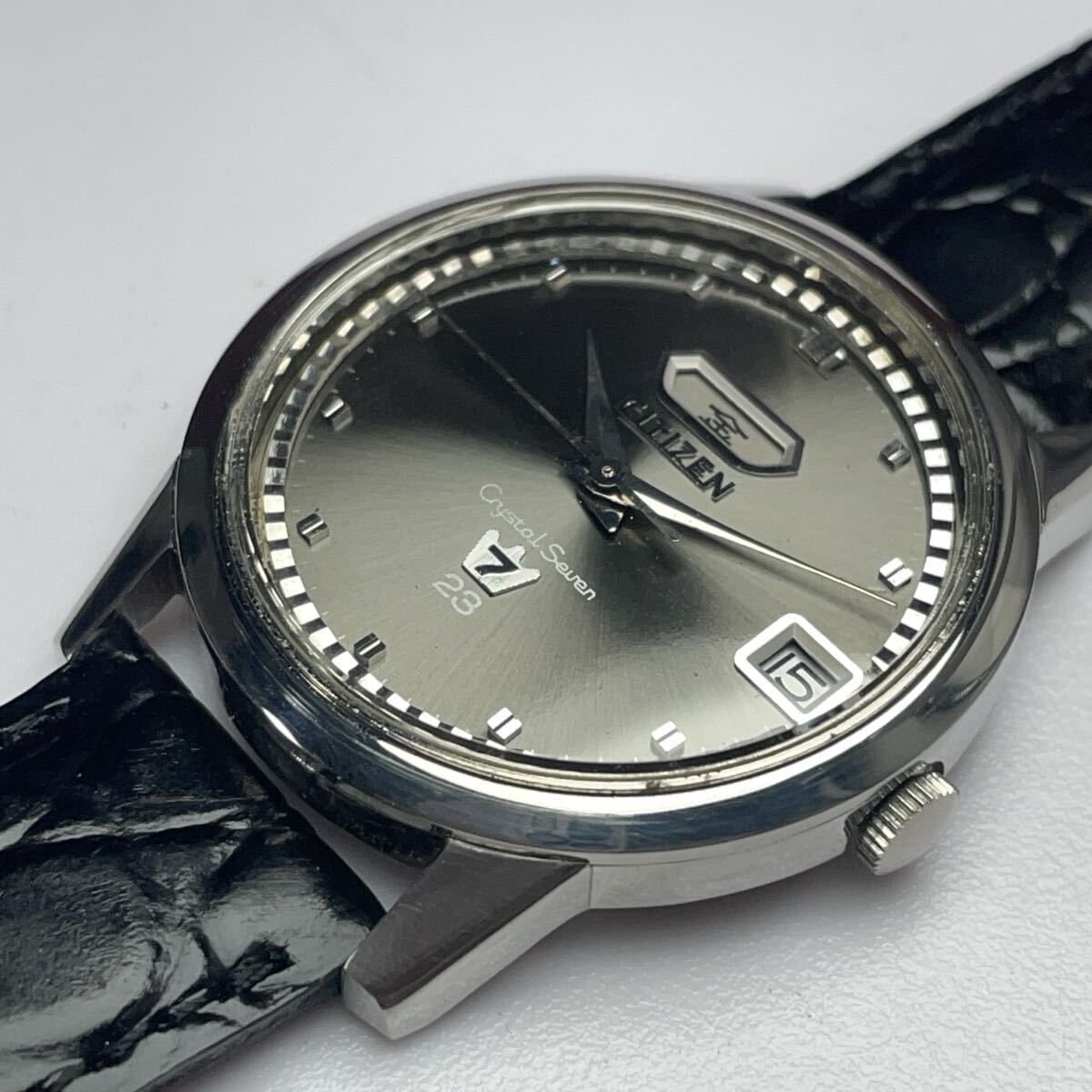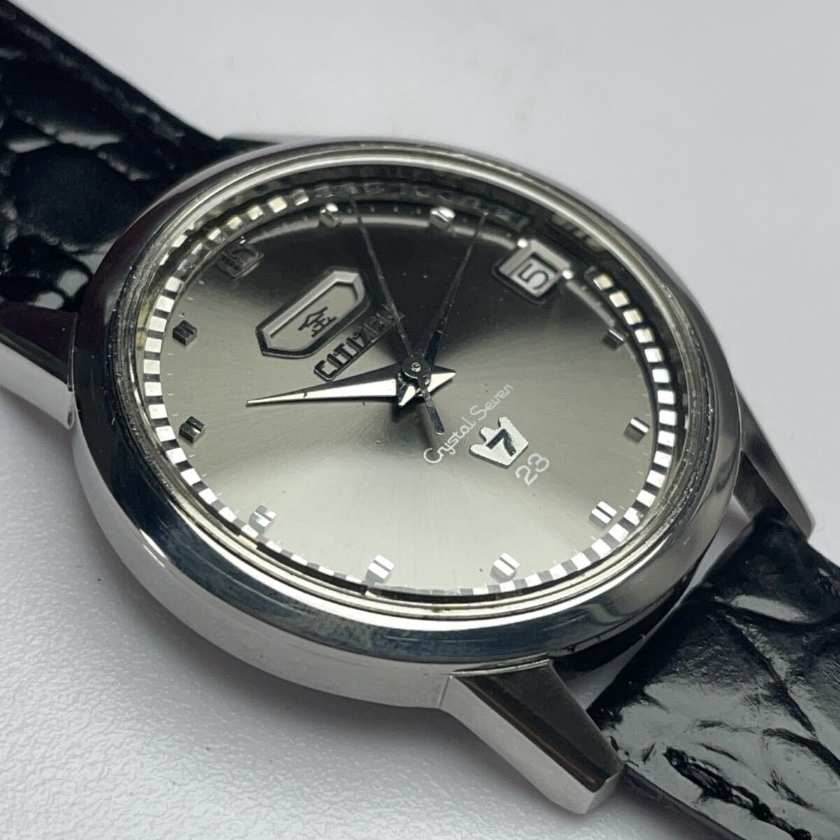 12時位置に曜日窓。3時位置に日付。6時位置に7マーク、12時位置にCITIZENロゴがアプライドされている実用的かつ洗練されたデザインです。
