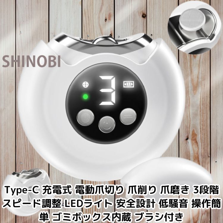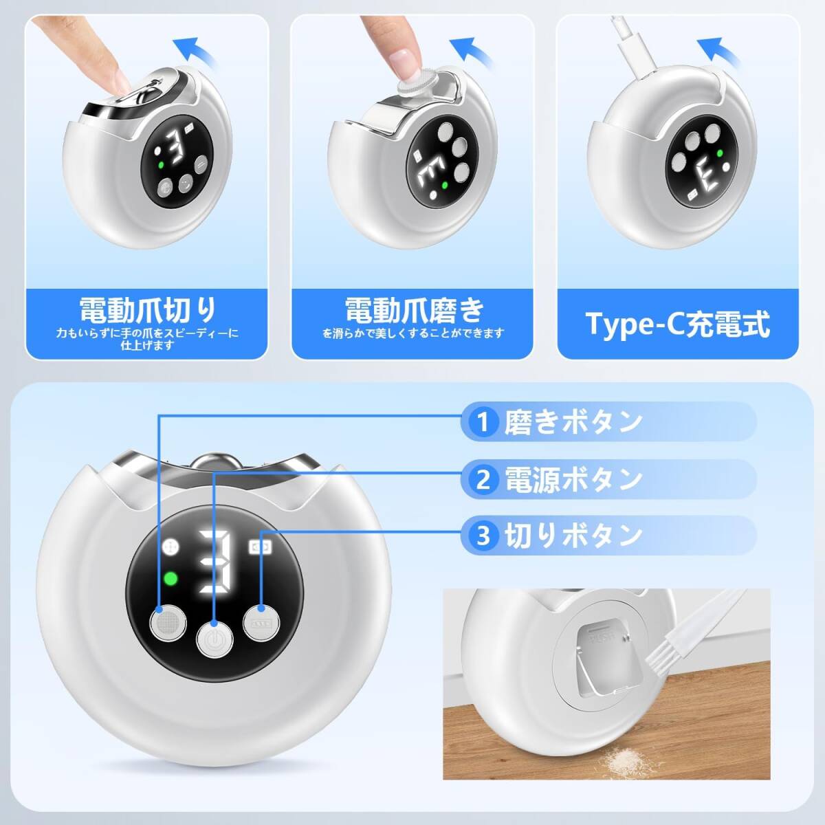 Type-C 充電式 電動爪切り 爪削り 爪磨き 3段階スピード調整 LEDライト 安全設計 低騒音 操作簡単 ゴミボックス内蔵 ブラシ付き