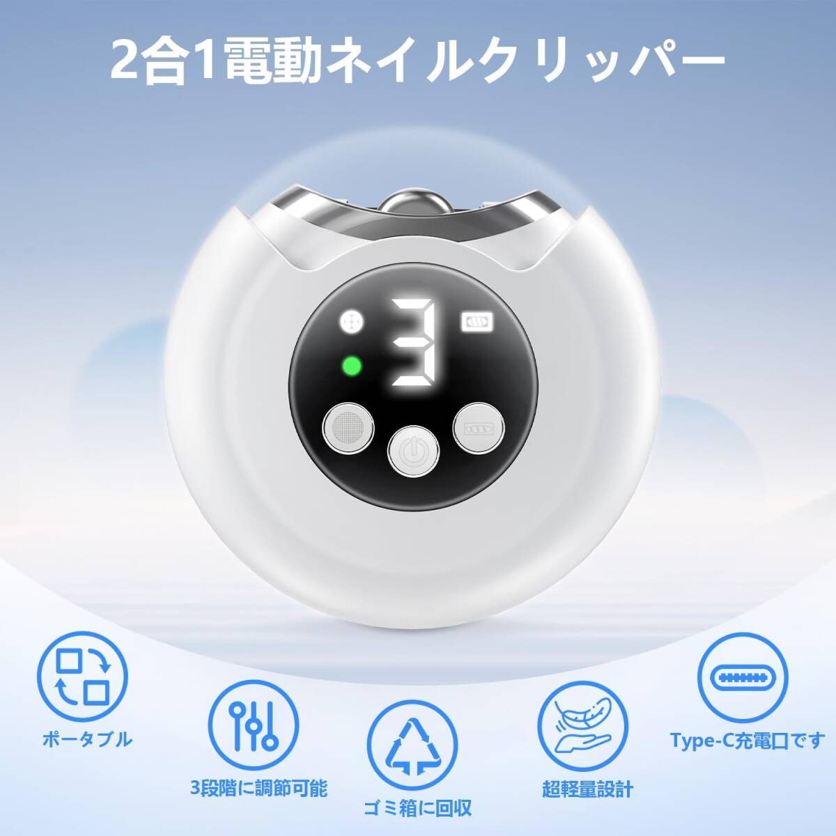 この電動ネイルクリッパーは、爪切りと爪磨きの機能を1台に集約した多機能モデルです。