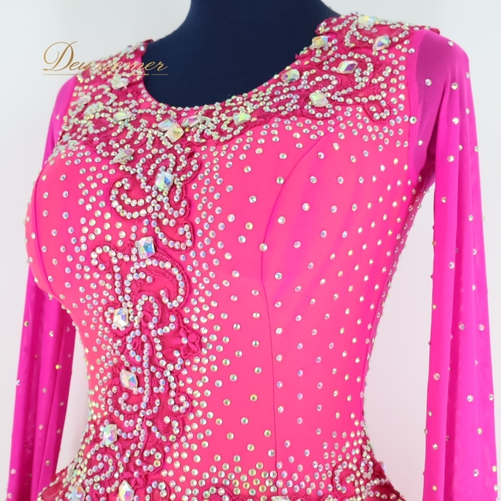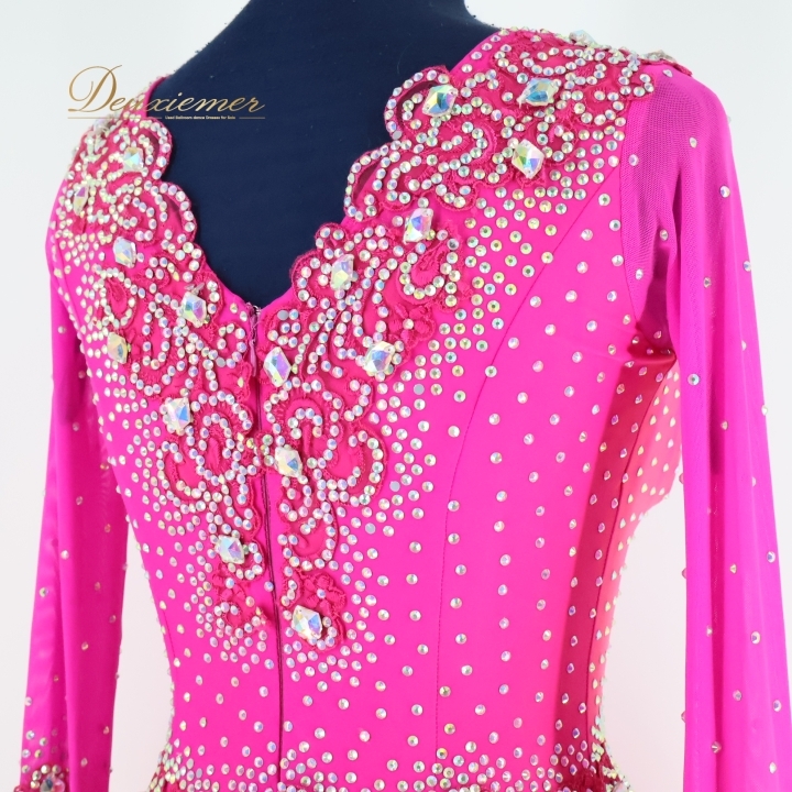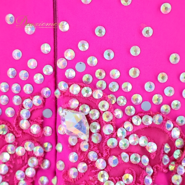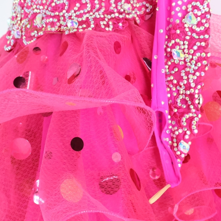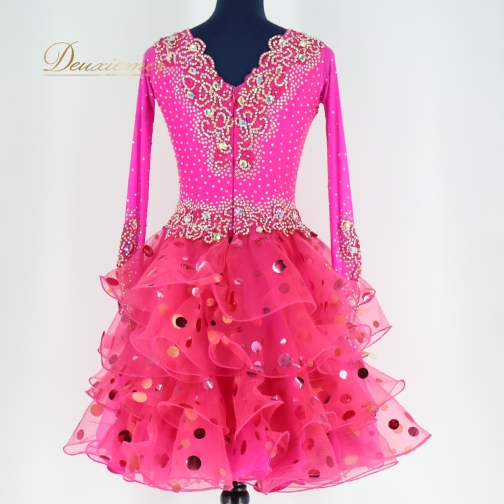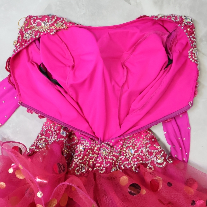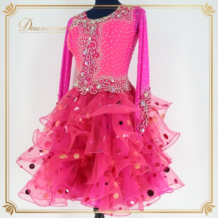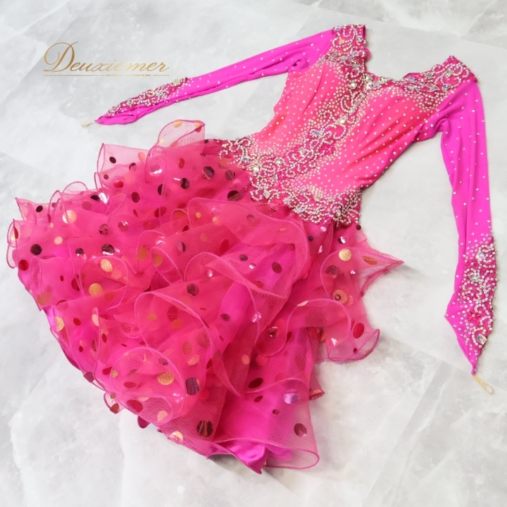 | 【商品名】社交ダンス 衣装 ラテン ドレス ワンピース 【サイズ】表記無し 平置き実測:総丈約88cm(裾~肩部まで)、身幅約38cm、ウエスト約29cm~ ※実測の為、多少の誤差はご了承ください 【仕様】 ・背面ファスナー仕様 ・レオタード(ボタン)仕様 ・上半身のみ伸縮性有り ・肩パッド無し ・胸パッド有り ------------------------------------ 【ポイント】 ▽濃いピンクがフロアで映える色味 ▽スカートのキラキラ水玉がかわいいデザイン ------------------------------------ 【撮影時使用トルソー】 種 類:女性用トルソー9号 (一般的に使用されるサイズです) サイズ:肩幅約37cm、バスト約88cm、ウエスト約66cm、ヒップ約89cm |