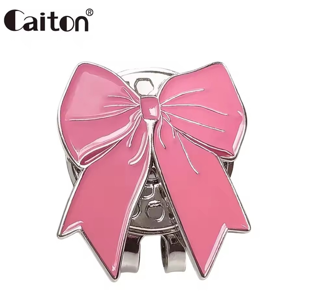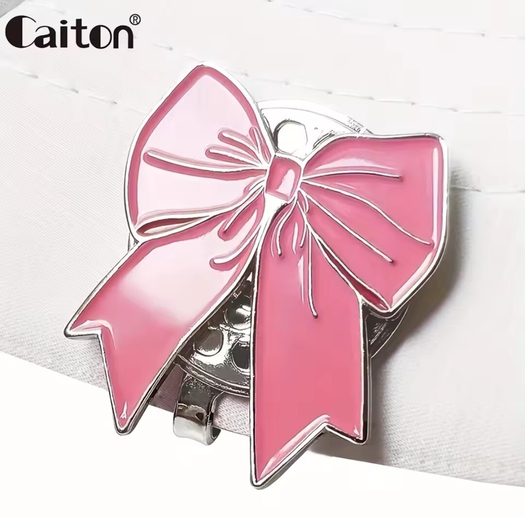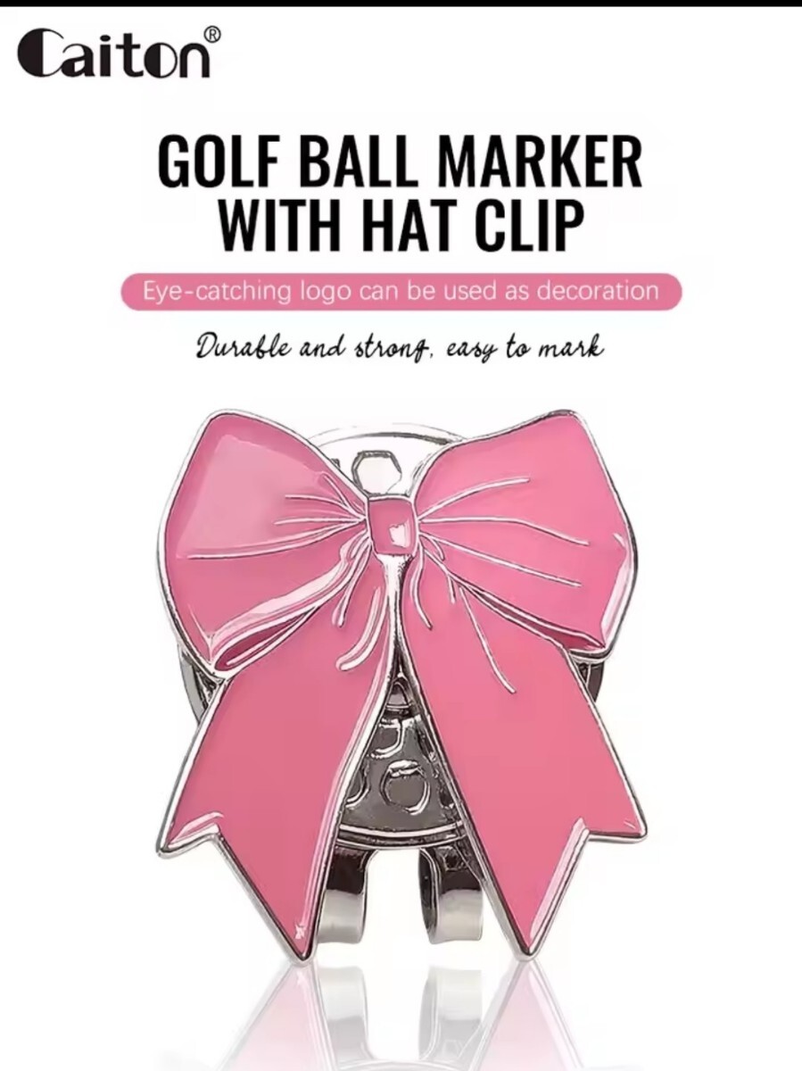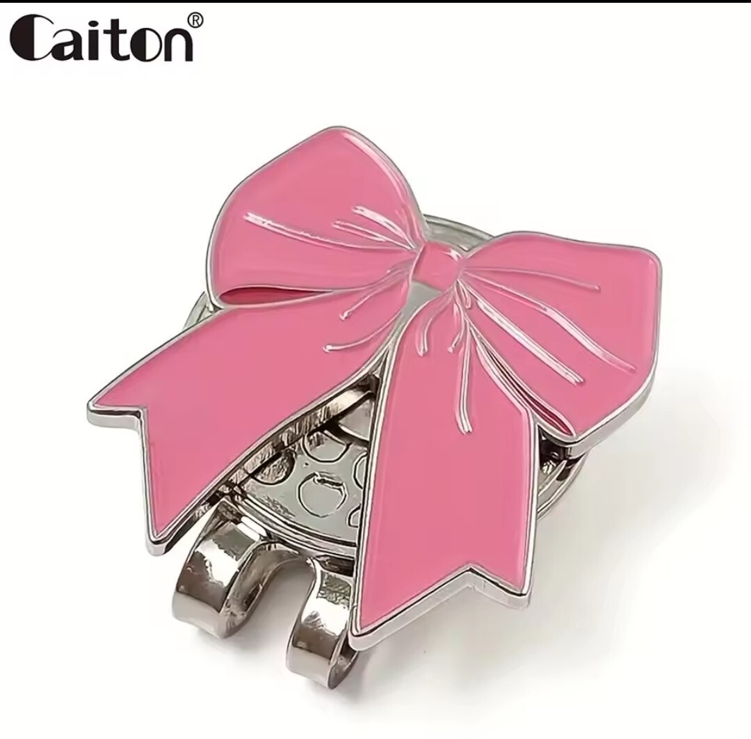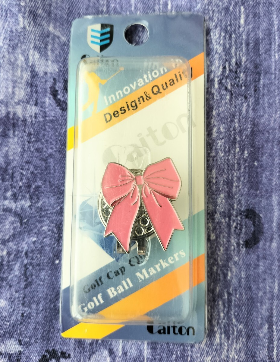 大きなピンクのリボンが目を引く、可愛らしいゴルフボールマーカーです。